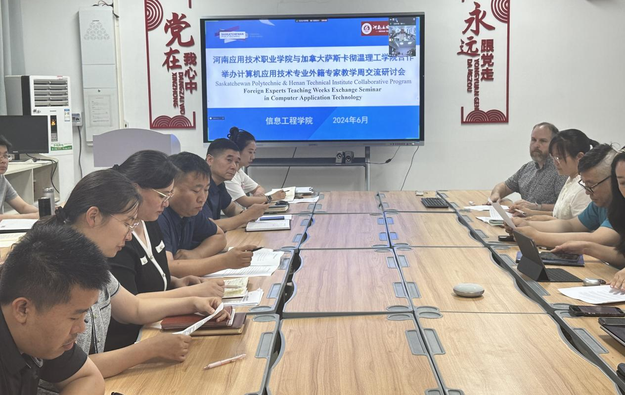 6月4日下午,信息工程公司在行政楼517会议室召开“加拿大萨斯喀彻温理工公司计算机应用技术专业中加合作办学项目中外教师交流研讨会”。中加国际合作项目主任、项目管理委员会委员Grace Liu 、项目管理专员Bruce Yu、加方专家Jason Schmidt、 Alex Wang, 信息工程公司专兼职教师参加会议。会议由夏丽珍副经理主持。