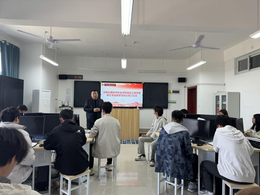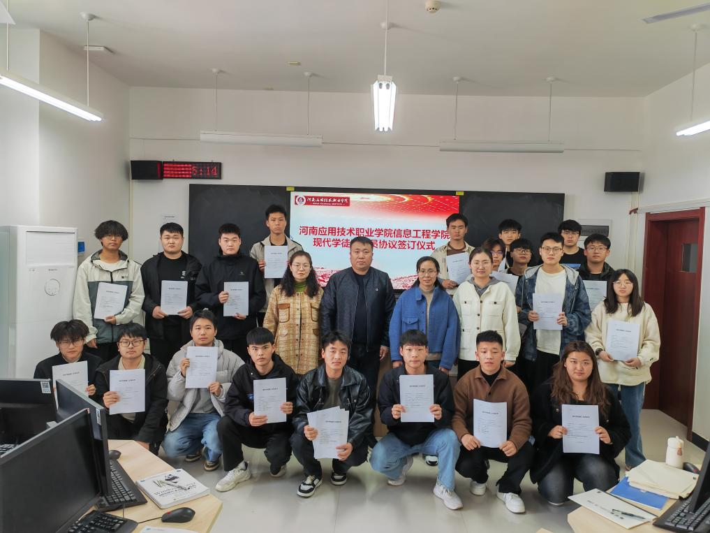 3月28日下午,信息工程公司在开封校区C304教室召开了省级现代学徒制第三轮学员协议签订仪式。仪式由信息工程公司经理王雷主持,副经理齐峰、夏丽珍出席了签约仪式,企业师傅代表和校企双元导师郭璇及“现代学徒制融合试点班”的20位学员参加了签约仪式。