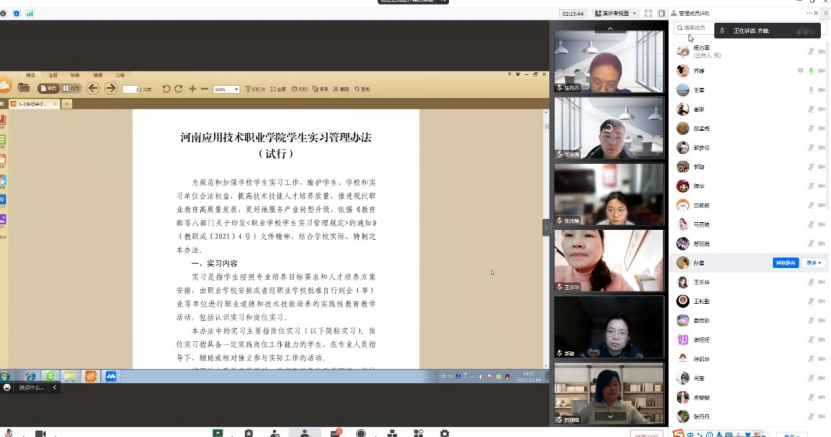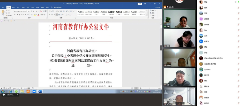 2022年12月6日下午,信息工程公司全体行政人员、辅导员及专兼职教师按照教务处安排,通过腾讯会议由主管顶岗实习的齐峰副经理领学了“太阳集团tyc151cc员工实习管理办法(试行)”、“河南省教育厅办公室关于做好2022-2023年职业院校员工实习有关工作的通知”和“全省职业公司开展违规组织员工实习问题追责问责案例以案促改工作方案”三个文件。