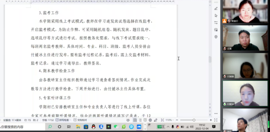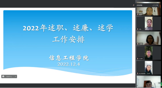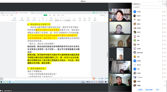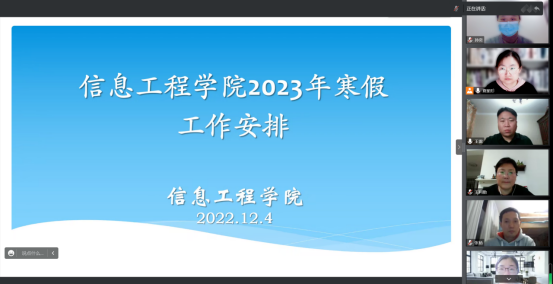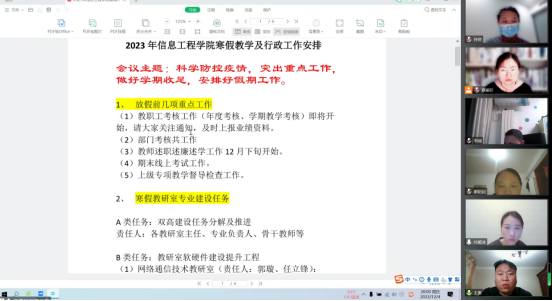 2022年12月4日晚19:30至20:30,信息工程公司通过腾讯会议召开了2022-2023学年第一学期线上期末工作会议,会议由夏丽珍副经理主持,王雷经理做整体工作部署,全体专兼职教师参会。