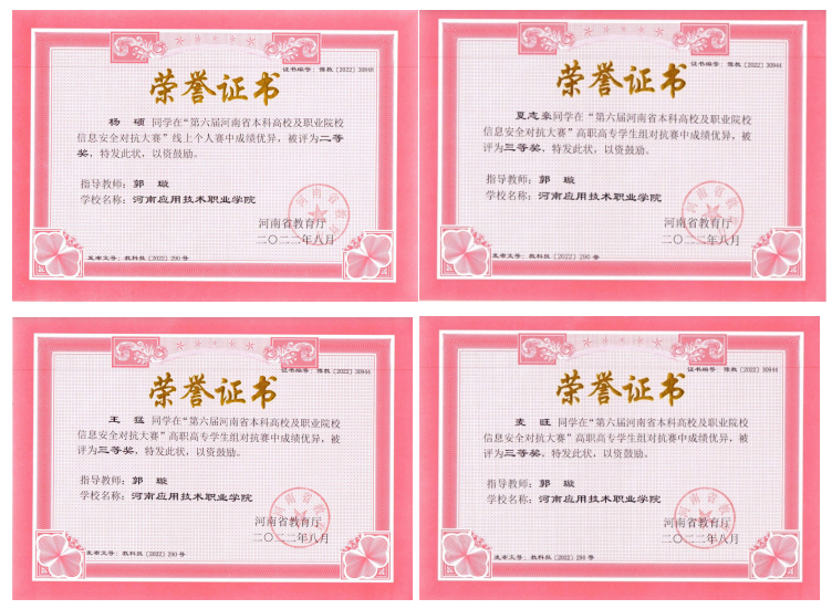 为深入贯彻落实习近平总书记关于网络强国的重要思想,锻炼网信领域特殊人才,促进网络空间安全团队建设和专业人才培养。8月17日至19日,由省教育厅主办,省高等公司计算机教育研究会、河南经贸职业公司、河南豫教新一代信息技术研究院共同承办的“第六届河南省本科高校及职业院校信息安全对抗大赛”在河南经贸职业公司举行。经过激励角逐,公司员工获得线上赛二等奖一项,线下团队赛三等奖一项,优秀指导教师奖一项。