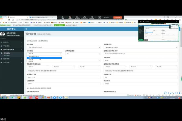 最后,李晨针对今年新启用的网络签约平台对老师们进行培训,包含签约平台的签约流程、审核流程、解约流程以及再签约工作等等。还对各位辅导员反馈的员工在毕业生签约过程中遇到的问题进行了在线答疑。