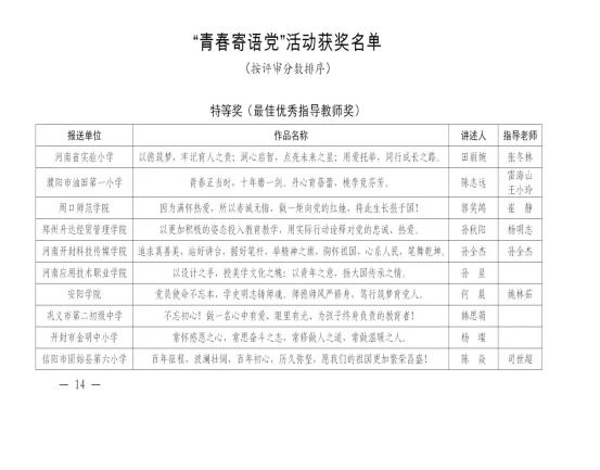 根据《河南省教育厅关于举办“100名师生颂党情”——“永远跟党走 奋斗新征程”庆祝建党100周年活动的通知》(教思政〔2021〕113号)精神,省教育厅组织开展了“1岁致敬100岁”“青春寄语党”和“讲个故事给党听”活动。