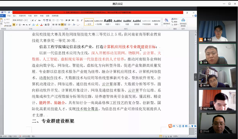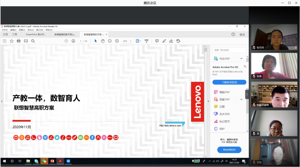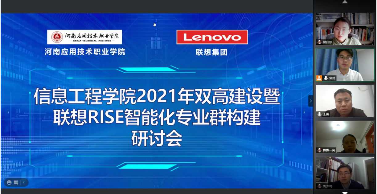 为落实公司双高建设任务,加强学科专业建设力度,优化专业结构,提高人才培养质量和办学效益。2021年1月26日下午,信息工程公司在腾讯会议平台召开了“2021年双高建设暨联想RISE智能化专业群构建线上研讨会”。经理王雷、副经理崔琳,办公室主任常昆以及教研室主任和专业相关骨干教师,企业方联想集团智慧教育业务总监王磊、智慧教育方案总监焦志虹、职教业务总监郭锋等19人参会。会议由常昆主任主持。