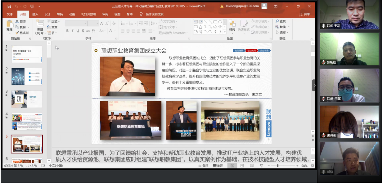 本次会议的核心议题是联想智能校院模式下的专业改造升级及课程锻造整合,首先,由联想集团领导及专家介绍校企合作模式及专业改造模式、课程建设规划思路等;智慧教育方案总监王磊提出“产教一体,数智育人”联想智慧高职方案,介绍了联想集团投资技术布局,联想对于职业教育的理解,联想.云计算运维一体化人才培养方案,提出以软实力(内涵)建设为主,建立稳定、长效和双赢的合作。