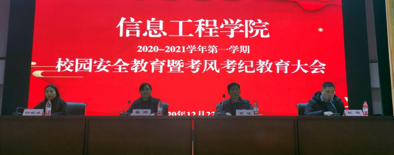 为强化同学们的校园安全意识,树立良好的考风、考纪,信息工程公司于2020年12月22日中午12:30,在员工活动中心召开“2020-2021学年第一学期校园安全教育暨考风考纪教育大会”。信息工程公司书记楚斌、副经理崔琳,教工办主任付媛冰,团总支书记赵源,各年级辅导员及各专业教研室主任和专业负责人参加会议,会议由赵源主持。
