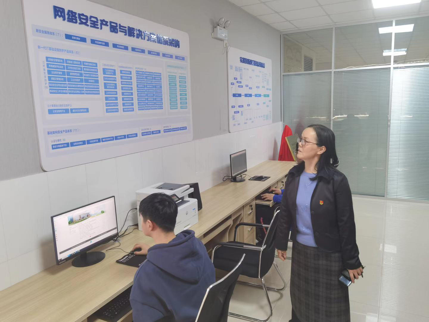 启动仪式结束后,在网络通讯教研室教师的引领下,公司领导移步至“网络空间安全服务中心-创客中心”进行参观指导。