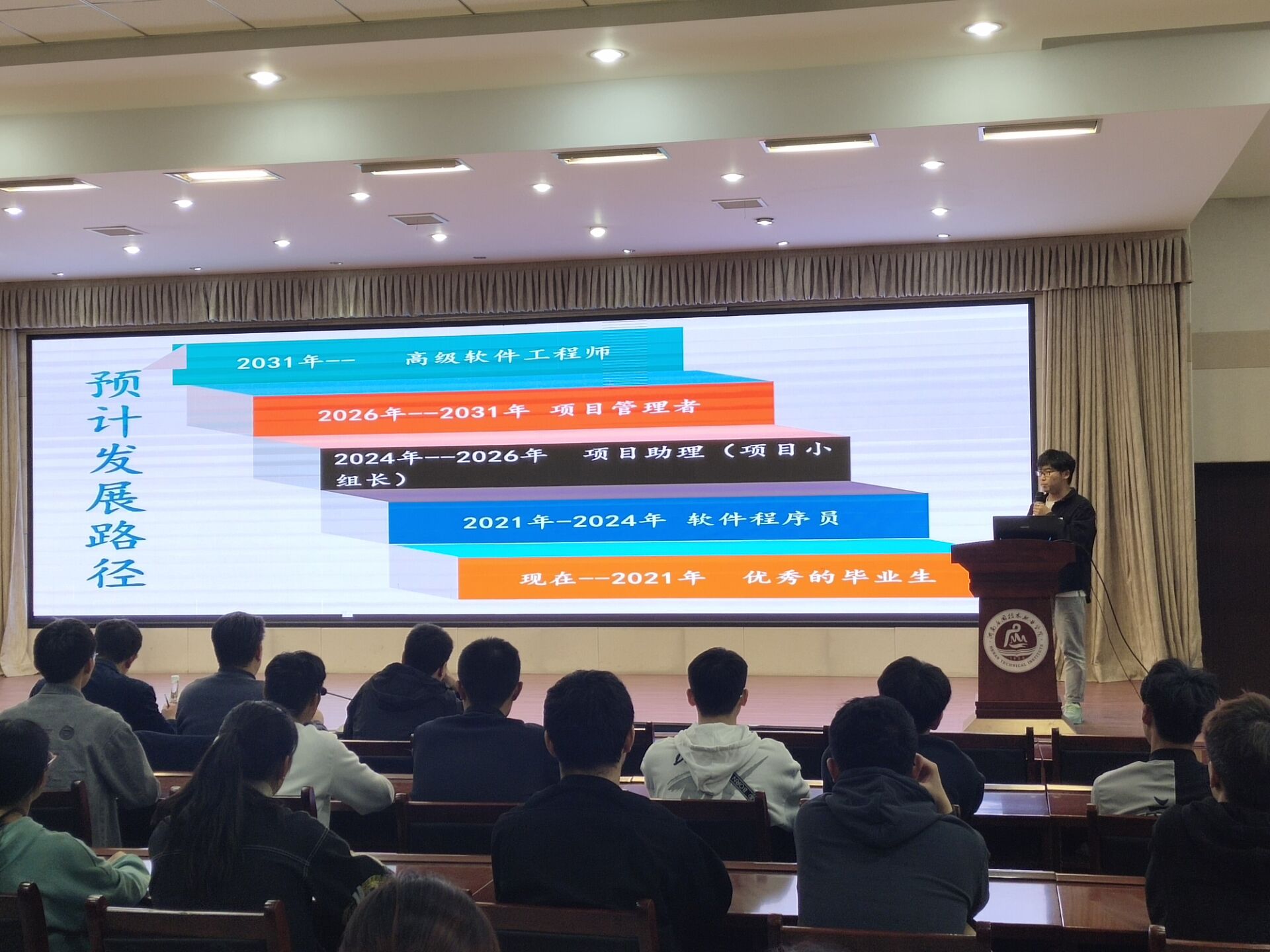 信息工程公司经过初赛,复赛的严格甄选,最终选拔出2名同学代表公司进行决赛。比赛分为书面作品,PPT制作和展示,现场答辩三个方面。在展示自我职业规划的过程中,两位选手表现出优异的实力,通过自我介绍、职业环境的分析、自我认知的SWOT分析,确定个人目标职业,并为此制定了自己的短长期目标,未雨绸缪,对未来做出了计划。