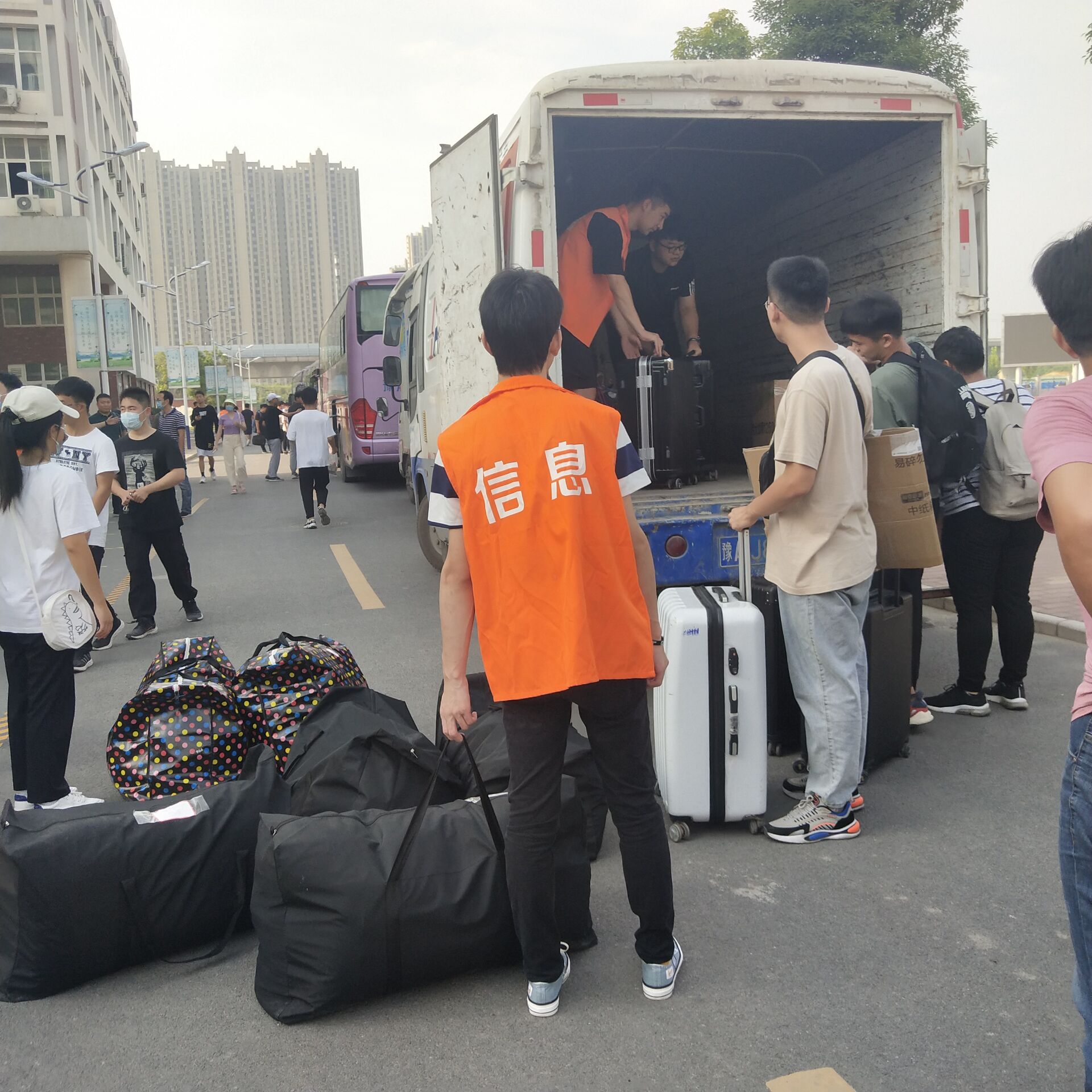 当日早上6:50信息工程公司团学会成员按照安排走到自己的岗位,积极开展各自所负责工作,组织19级计算机专业同学们按规定地点整齐摆放各自行李,并帮助同学们将行李进行装车。让19级计算机专业同学在临走时感受到来自信息工程公司这个大家庭中成员的不舍与关心。
