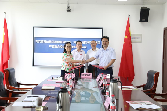 7月20日,太阳集团tyc151cc与奇安信科技集团股份有限公司(以下简称奇安信集团)产教融合校企战略合作签约仪式在郑州校区办公楼会议室315隆重举行。奇安信集团副总裁何新飞、助理总裁魏雨露、教育行业部区域总监陈昱豪、河南教育销售总监齐壮、河南教育售前经理王超,公司董事长范晓伟、副董事长陈君丽、教务处处长黄振中、人才招聘处副处长李向民、信息工程公司经理王雷、副经理崔琳等其他相关领导及教师代表出席签约仪式。