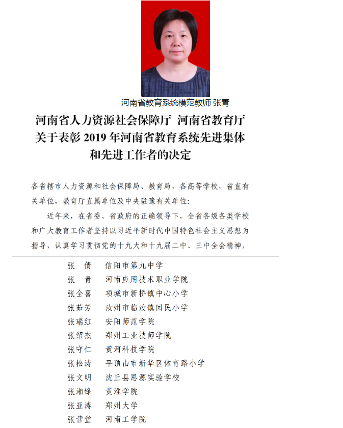 近日,省人力资源社会保障厅,省教育厅公布了关于表彰2019年河南省教育系统先进集体和先进工作者的决定,公司张青老师荣获2019年河南省教育系统模范教师荣誉称号。