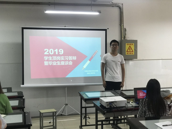 2019年6月10日上午,信息工程公司16级毕业生在E403进行了顶岗实习答辩暨毕业生座谈会。王雷经理和杨明杰书记参加了会议,会上网络专业的安海伟、计算机专业的万超和视传专业的徐辉等同学代表16级毕业生进行了现场答辩,顶岗实习指导教师张振平老师、王碧琳老师与员工进行了提问和交流。通过本次答辩和座谈会,公司获取了员工在顶岗实习期间的心得和感受,对信息工程公司的专业建设和顶岗实习管理工作提供了第一手的信息。