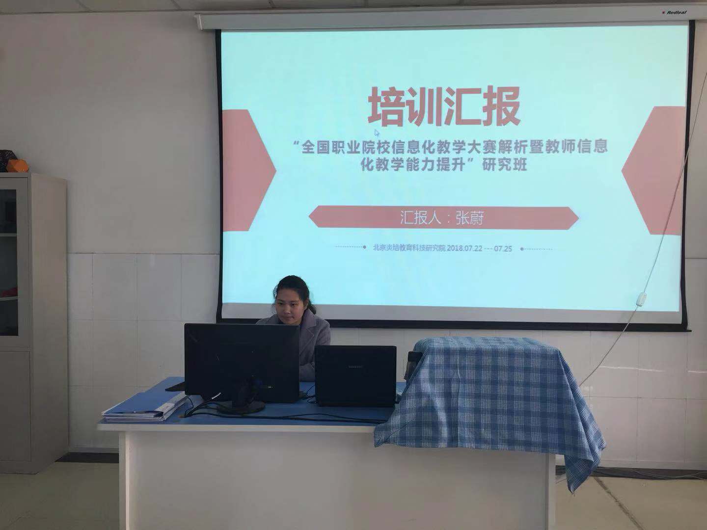 信息工程公司艺术设计教研室教师张蔚于2018年7月22日—7月25日,参加了参加由北京炎培教育科技研究院举办的“全国职业院校信息化教学大赛解析暨教师信息化教学能力提升”高级研修班。通过此次培训在公司产品方面收获颇多,张蔚老师于10月中旬向信息工程公司领导、教师对此次培训进行汇报总结。