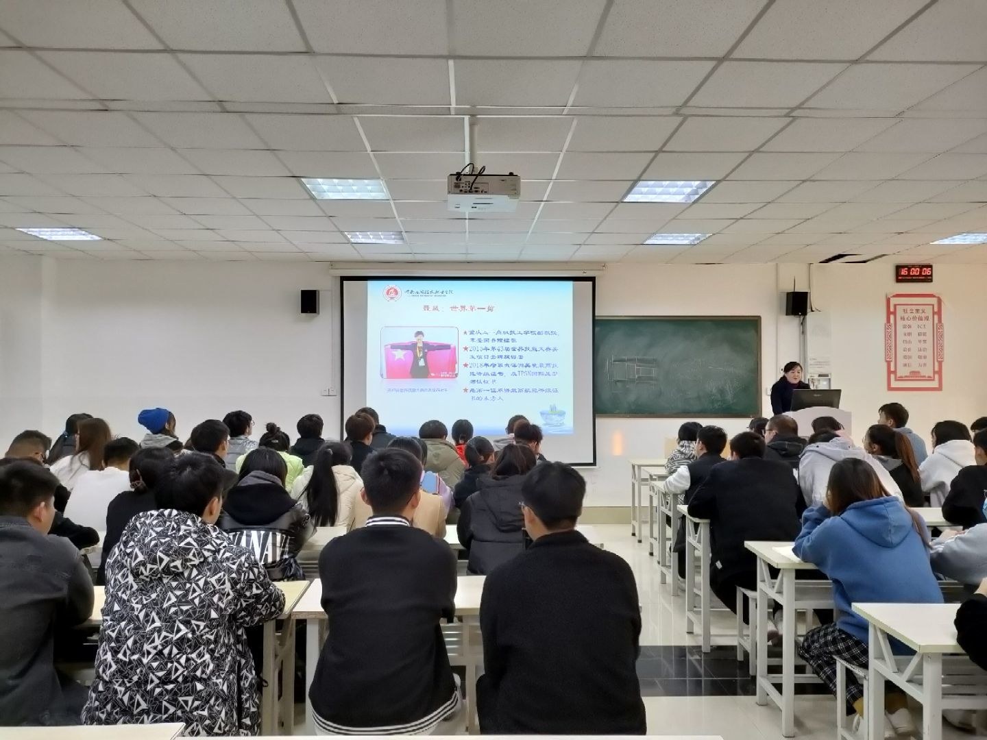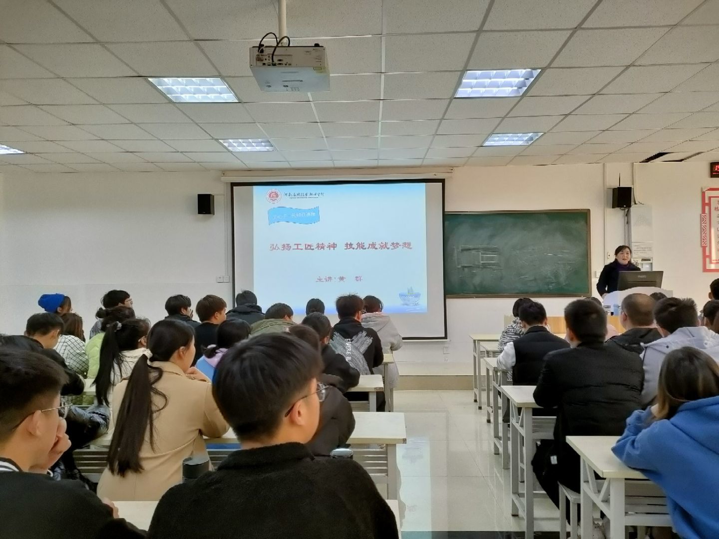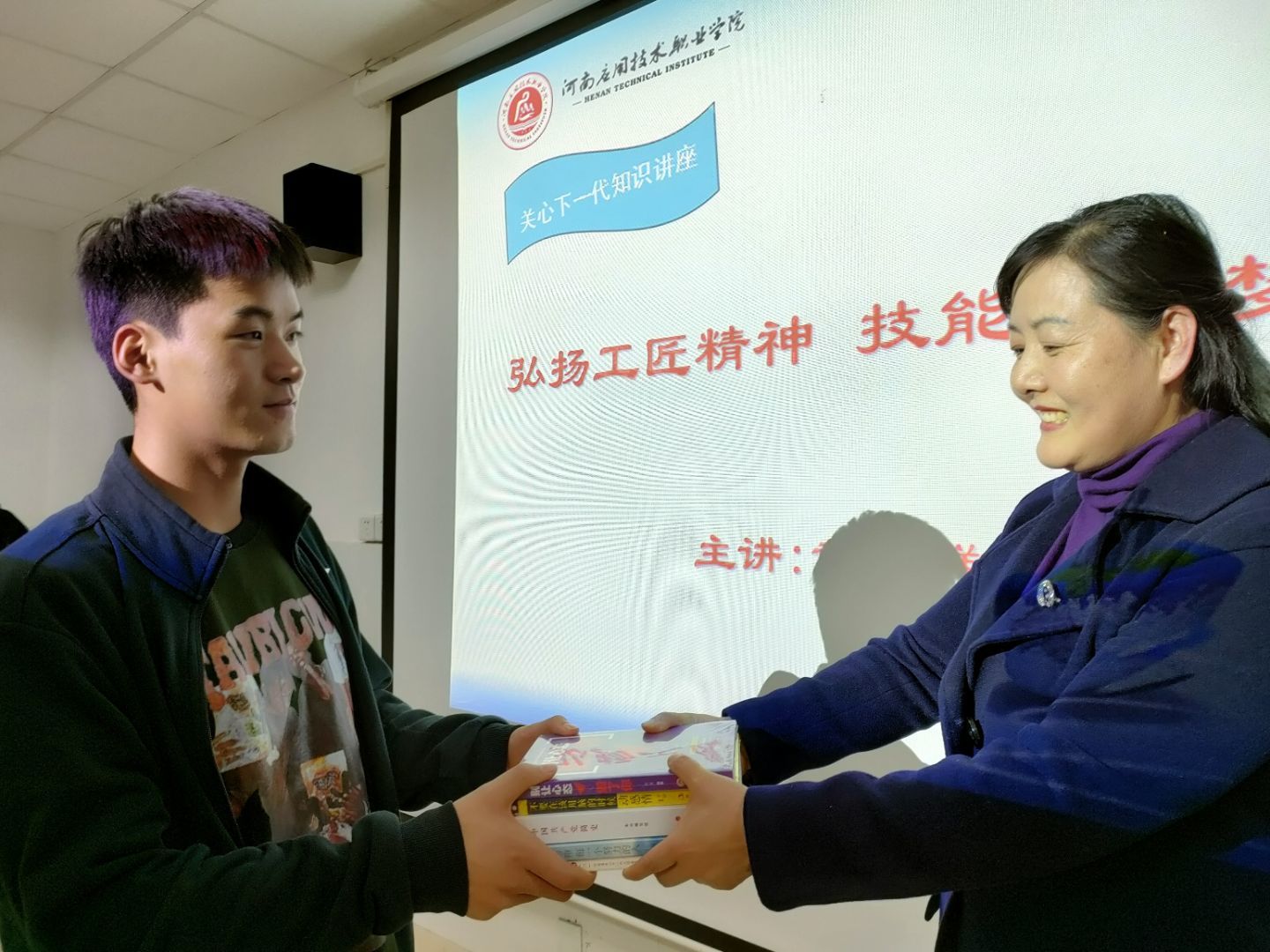 活动伊始,首先由赵源老师和徐娟老师为同学们赠予相关书籍,旨在让他们充满梦想与希望,更深入的学习、弘扬“工匠精神”;之后,黄群教授为同学们进行了一场《弘扬工匠精神 技能成就梦想》的知识讲座,主要通过讲述一些我国具有奋斗精神、工匠精神的真实事例让同学们从中获得具有工匠精神的知识与力量,并向同学们介绍了一批批优秀劳动楷模及公司往届优秀毕业生典范,让同学们感受到了榜样的力量,从而更加鞭策自己向大国工匠的目标奋进。在老师慷慨激昂的演讲中同学们也感慨良多,铭记于心,力求在将来的学习、生活和工作中把平凡的事干到极致。