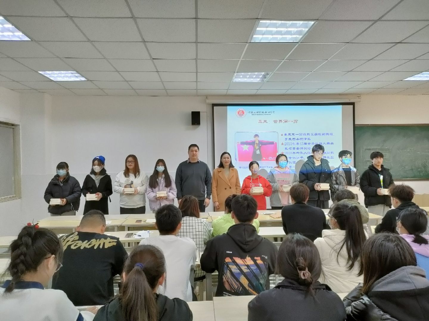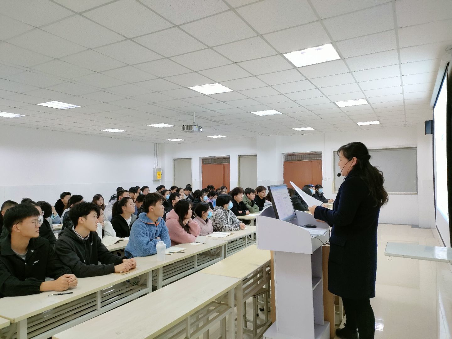 此次活动共分为两个环节:赠书与讲座。活动开始前,公司员工会成员组织60名参加人员进行集合、点名并完成签到,人员清点后带领同学们前往E楼406教室,组织同学们有序入座。