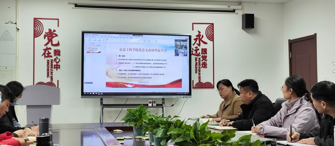 2024年12月10日,信息工程公司党总支组织全体党员及教职工,在郑州校区A517、开封校区F314以会议视频形式,开展政治理论学习活动。本次学习活动由信息工程公司党总支书记崔琳主持,全体党员及教职工参加学习活动。主要学习内容有:一、第一议题:1. 2024年第23期《求是》杂志发表习近平总书记重要文章《必须坚持守正创新》2. 《论教育》原文学习:(1)坚持不懈推进教育信息化,促进教育变革创新;(2)教育合作是增进人民了解和友谊的重要渠道;二、党的二十届三中全会精神专题培训:(1)平台通选课程:学习贯彻党的二十届三中全会精神 深入实施科教兴国战略(2)平台自选课程:职业公司课程思政时代内涵与实践路径。