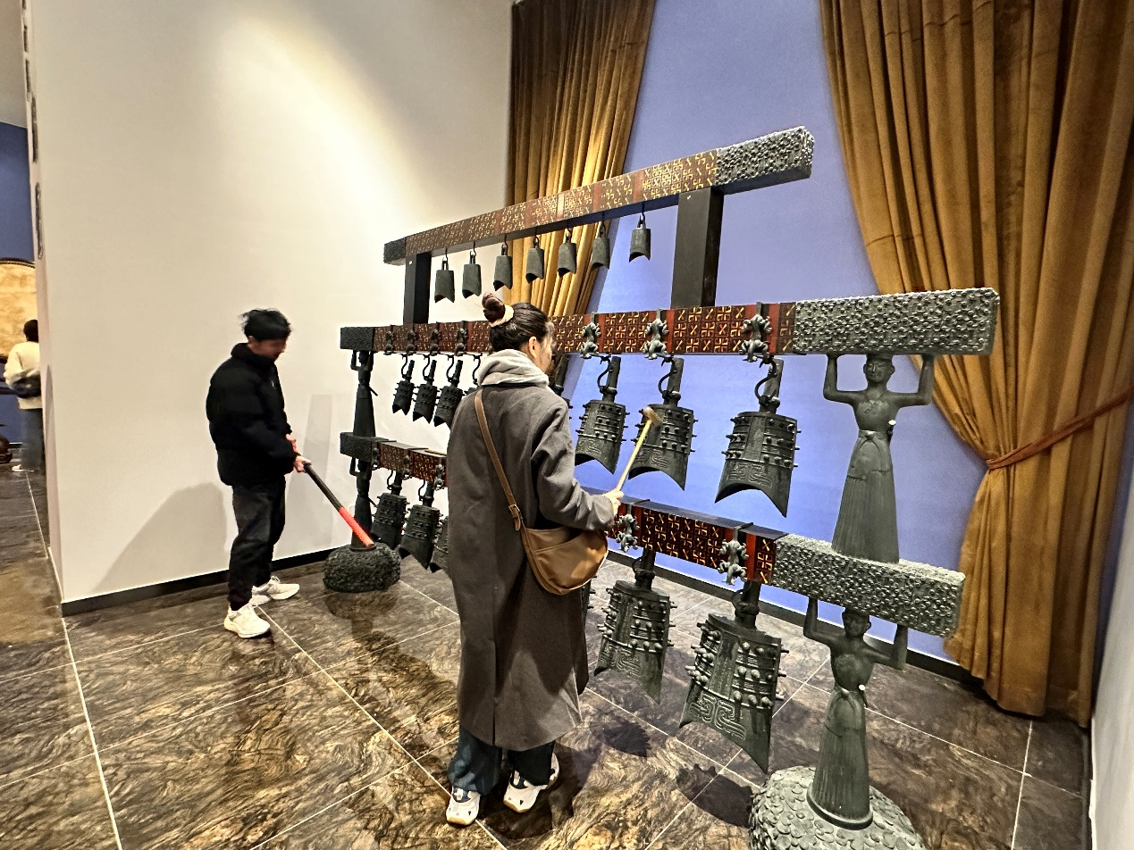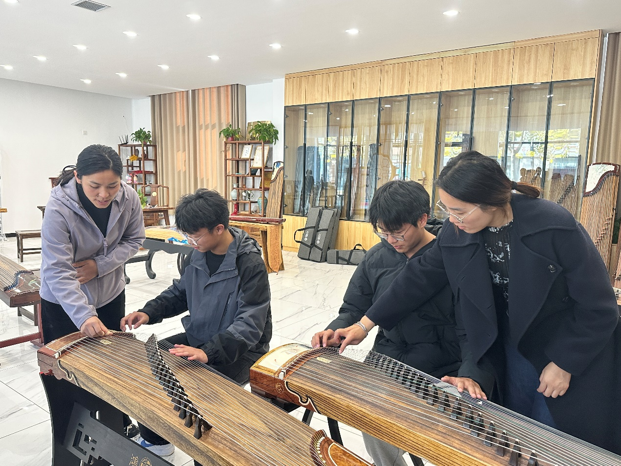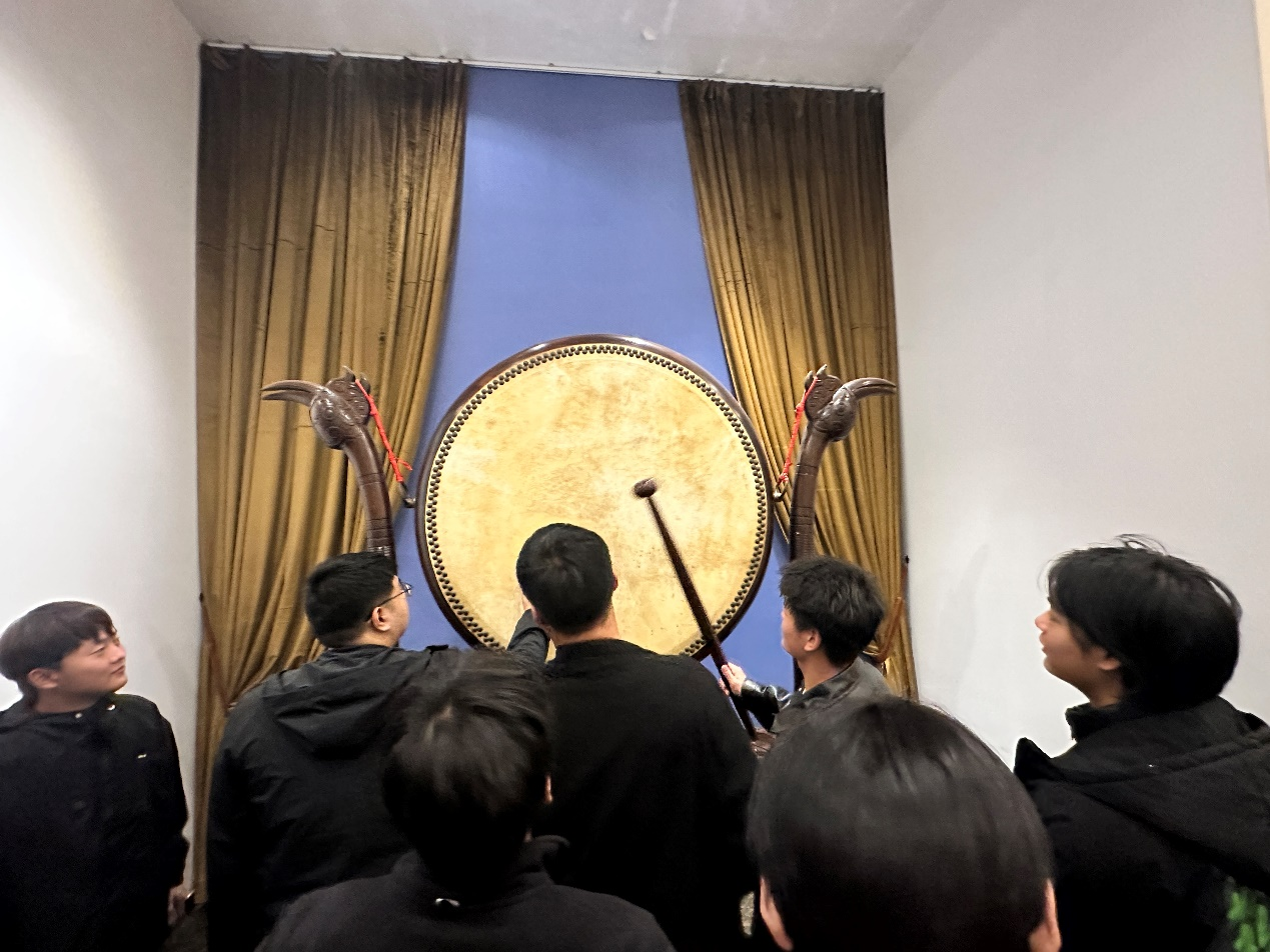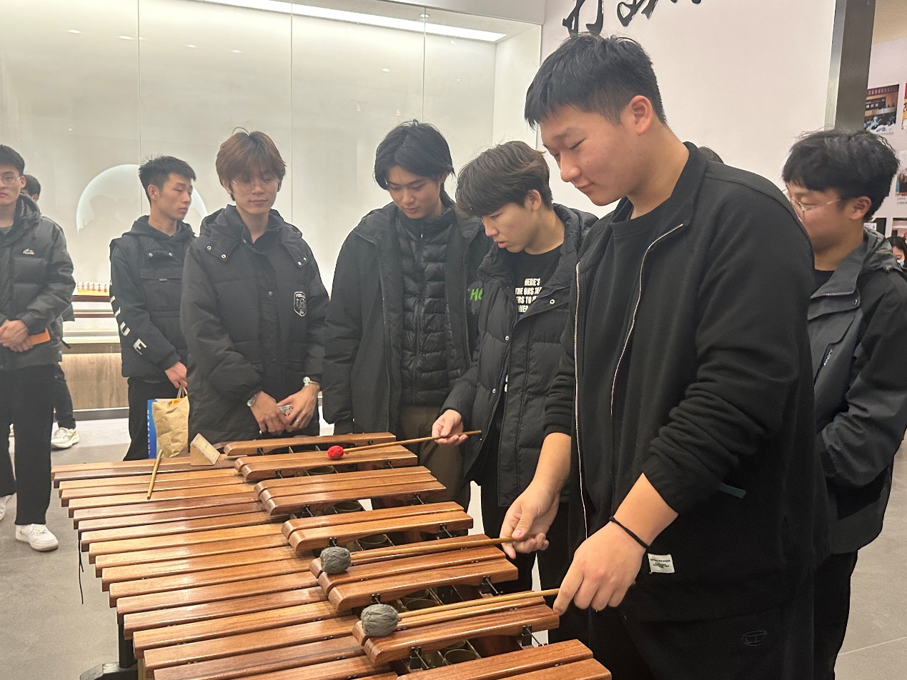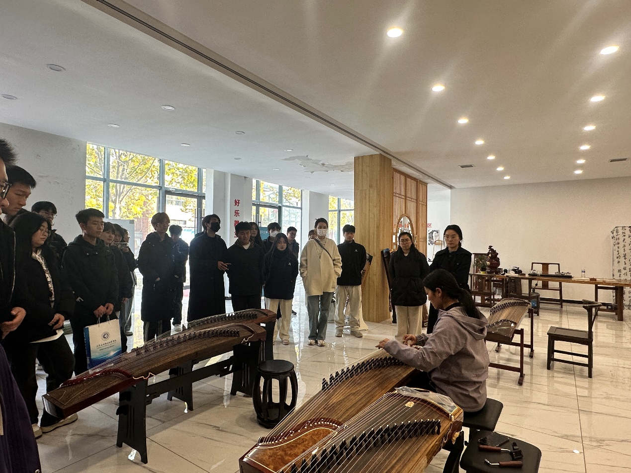 活动过程中,琴社负责人带领同学们到达多个斫琴展览室,并详细地向同学们介绍了多把琴的制作工艺流程。在不同展览室内,同学们也第一次有机会近距离接触古典乐器,了解其制作背景。当到达体验区时,更是按耐不住自己激动的心情,“击鼓、抚琴、敲磬”,沉浸式体验了一把文人雅士的志趣!为使同学们体验感更深刻,互动交流环节,基地老师更是亲自俯身,演奏琴曲。为同学们带来了一堂生动的古琴艺术鉴赏课,让员工“零距离”感受中华传统文化的别样魅力!