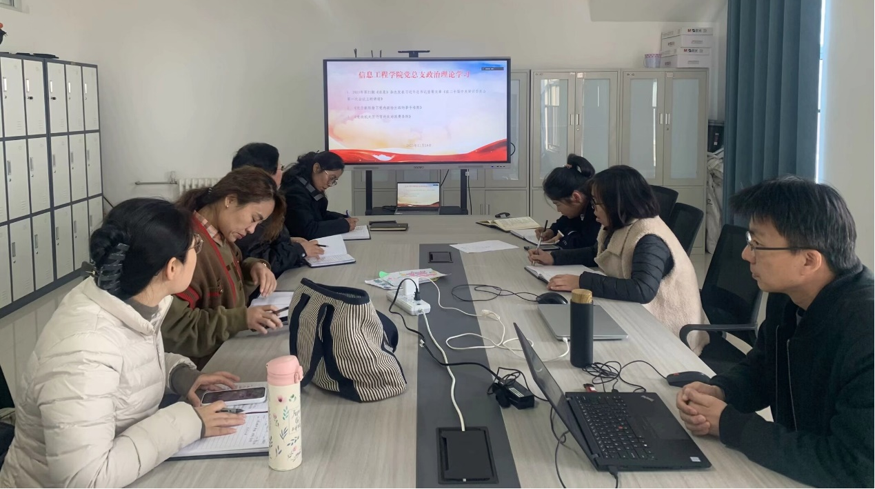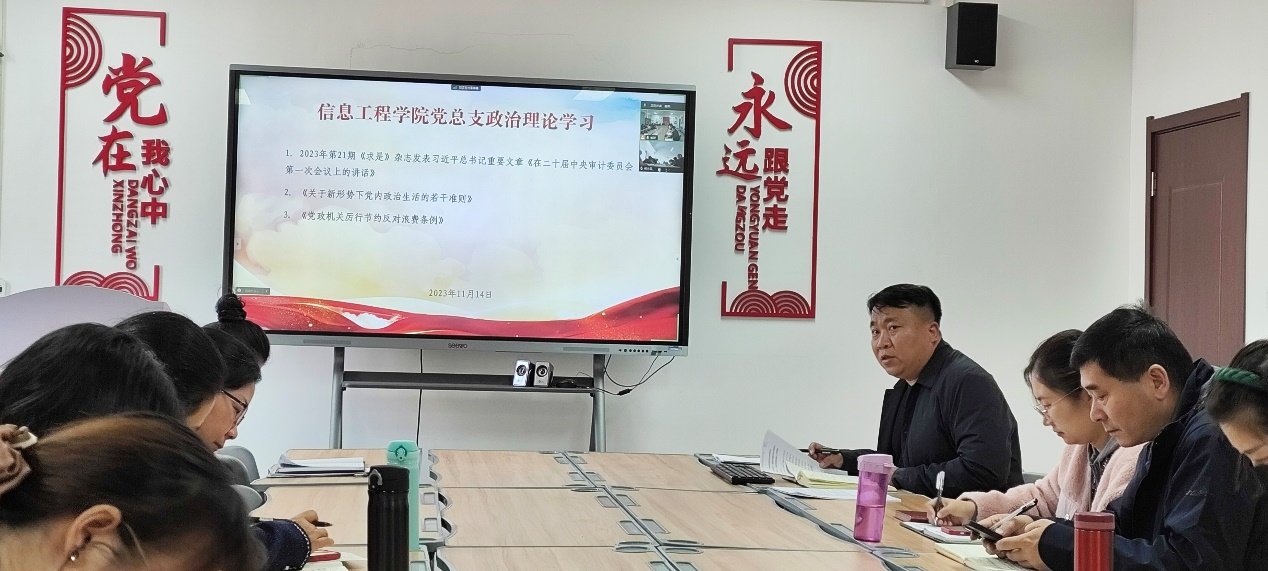 2023年11月14日信息工程公司党总支组织全体党员及教师在郑州校区A514、开封北院C314开展政治理论学习活动,王雷经理主持会议。本次政治理论学习活动的内容包括:1.2023年第21期《求是》杂志发表习近平总书记重要文章《在二十届中央审计委员会第一次会议上的讲话》;2.《关于新形势下党内政治生活的若干准则》;3.《党政机关厉行节约反对浪费条例》。