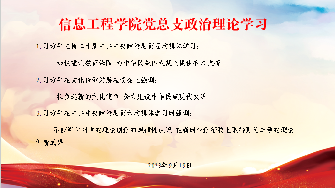 2023年9月19日,信息工程公司党总支组织东西校区全体党员及教职工,在西校区A514、东校区以腾讯会议视频连接,开展政治理论学习活动。本次学习活动由信息工程公司党总支书记崔琳主持,全体党员及教职工参加会议。