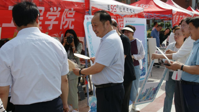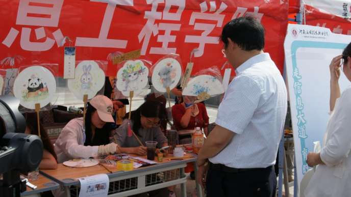 彩旗飘扬,热闹的氛围里,帐篷下忙碌的身影……2023年5月15日下午2:30分,在骄阳似火的天空下,在郑州校区员工活动中心、北广场、开封校区南院的职业教育活动周开幕式正式开始。尽管天气炎热,却不消同学们的活动激情,展位中的同学们精神饱满神采奕奕,前来参与的同学们也喜气洋洋,公司领导到各个展位前参观,一片热闹景象。