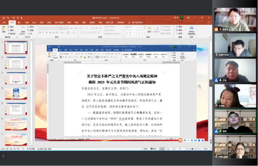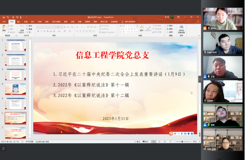 会议第二项,崔琳梳理总结2022年公司党建工作要点及廉政工作落实情况,传达并组织学习公司纪委近期下发的三个重要文件。会议中指出,按照《河南省纪委监委驻省教育厅纪检监察组关于2023年元旦春节期间纠”四风”树新风工作提示》及公司纪委《关于坚定不移严之又严落实中央八项规定精神 确保 2023 年元旦春节期间风清气正的通知》精神,信息工程公司党总支在2022年12月29日、31日组织全体教职工进行了相关文件学习,在2023年1月4日、6日分两次学习了违反中央八项规定典型案例、违反教师职业行为典型案例,并在1月5日采用新媒体形式进行了集体廉政提醒谈话。1月11日上午,组织全体教职工学习《习近平在二十届中央纪委二次全会上发表重要讲话》、2022年《以案释法》第十一辑、2022年《以案释法》第十二辑,崔琳书记再次强调元旦春节既是“人情关”,更是“廉洁关”,要求每一位教职工在元旦春节期间牢记校纪委通知精神,纠四风树新风,过一个廉洁祥和文明的假期。