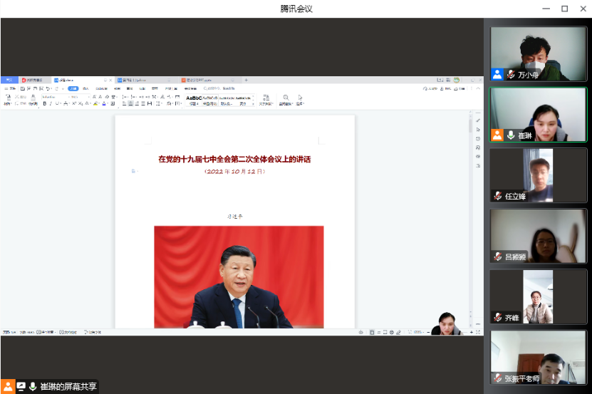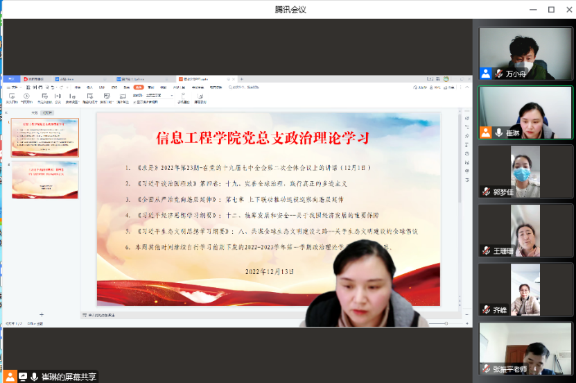 为持续学习贯彻好党的二十大精神,达到了统一思想、坚定信心、明确方向、鼓舞斗志的目的,12月13日下午,信息工程公司党总支组织东西校区全体党员及教职工,在腾讯会议开展线上政治理论学习活动,集中学习了:《求是》2022年第23期--在党的十九届七中全会第二次全体会议上的讲话(12月1日);《习近平谈治国理政》第四卷:十九、完善全球治理,践行真正的多边主义;《全面从严治党向基层延伸》:第七章上下联动推动巡视巡察向基层延伸;《习近平经济思想学习纲要》:十二、统筹发展和安全--关于我国经济发展的重要保障;《习近平生态文明思想学习纲要》:八、共谋全球生态文明建设之路--关于生态文明建设的全球倡议。本次政治理论学习由信息工程公司党总支书记崔琳主持,全体党员及教职工参加会议。