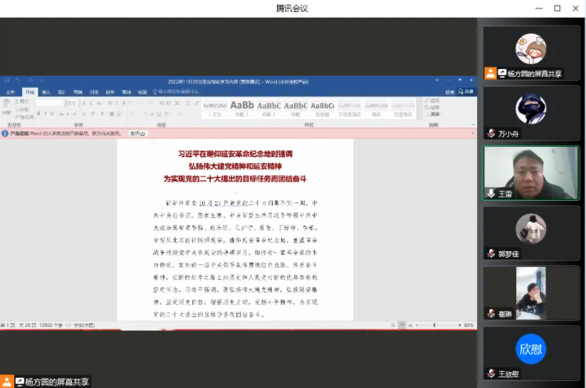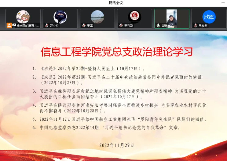 为进一步深入学习贯彻党的二十大精神,牢牢把握新时代新征程的使命任务,2022年11月29日下午,信息工程公司党总支组织东西校区全体党员及教职工,在开封北院A306及腾讯会议开展线上线下同步的政治理论学习活动,集中学习了:《求是》2022年第20期-坚持人民至上;《求是》2022年第22期-习近平在二十届中央政治局常委同中外记者见面时的讲话;习近平在瞻仰延安革命纪念地时强调弘扬伟大建党精神和延安精神 为实现党的二十大提出的目标任务而团结奋斗;习近平在陕西延安和河南安阳考察时强调全面推进乡村振兴 为实现农业农村现代化而不懈奋斗;2022年11月12日习近平给中国航空工业集团沈飞“罗阳青年突击队”队员们的回信;中国纪检监察杂志2022第14期 “习近平总书记论党的自我革命”文章。本次学习由信息工程公司党总支书记崔琳主持。