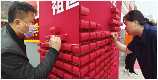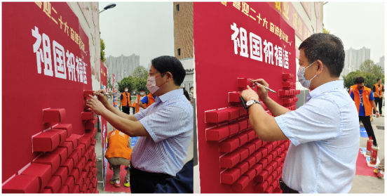 师生共 " 拼 " 爱国心,共抒浓浓爱国情。为宣传红色精神,厚植永不褪色的爱党爱国情怀,增强师生间的互动与交流,党员教师带领本公司员工志愿者一起拼装背景板,折叠红色小纸盒,用折好的红色纸盒拼贴成中国版图在展板上,并邀请公司广大师生在红色纸盒上手写国庆节祝福语,让大家尽情抒发对祖国深深的热爱与美好祝福。活动中,公司领导也纷纷前来参与并在展板处郑重写下自己对祖国生日的祝福,“我爱祖国”,“祖国万岁”,“祝愿祖国明天更美好”,简单质朴的话语,让活动的氛围达到高潮。一句句饱含深情的祝福体现了广大师生对祖国深沉的爱,和对祖国未来发展的美好愿景。一颗颗饱含深情的爱国心,汇聚成一幅雄伟辽阔的的中国版图,表达党员教师和员工志愿者心连心,携手奋进,共谱新华章。