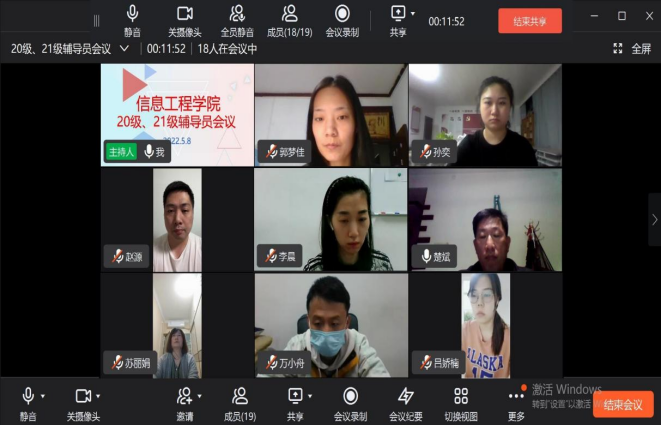 当前省内疫情形势严峻复杂,为全面贯彻落实近期疫情防控会议精神,进一步做好疫情防控下员工管理工作,保证师生安全健康,5月8日晚8点,信息工程公司召开疫情防控工作专题会议,落实公司疫情防控工作任务。党总支书记楚斌、学工办主任闫莹及全体辅导员参加了本次会议,会议由学工办主任闫莹主持,会议采用线上形式进行。