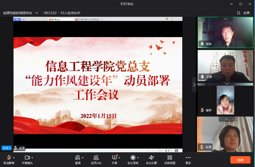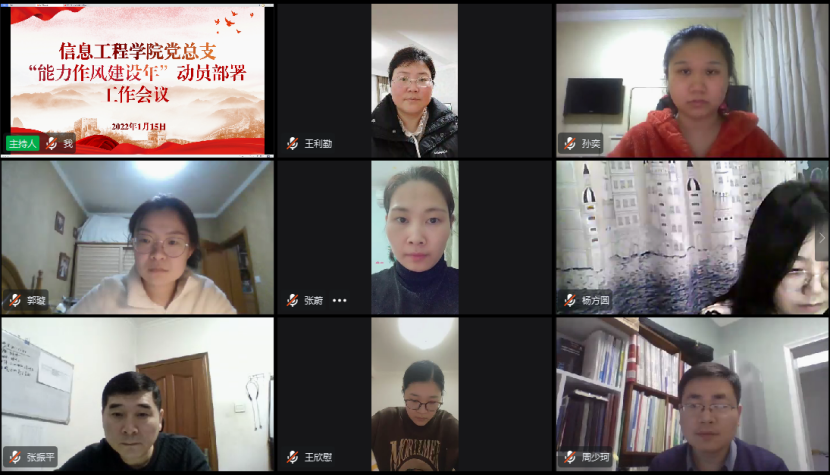 为深入学习贯彻党的十九届六中全会精神,贯彻落实习近平总书记视察河南重要讲话、重要指示,推进公司治理体系和治理能力现代化,动员广大党员干部践行初心使命、强化“答卷”意识,切实把公司党委“能力作风建设年”活动部署落实落细,2022年1月15日晚八点,信息工程公司党总支组织全体教师通过钉钉会议平台开展主题党日活动,进行网上集中学习,会议由信息工程公司党总支书记楚斌主持。