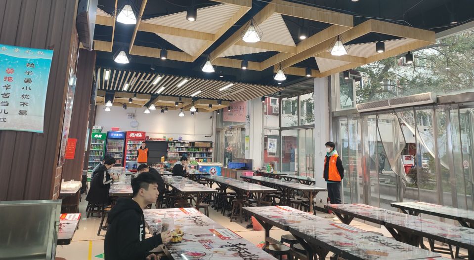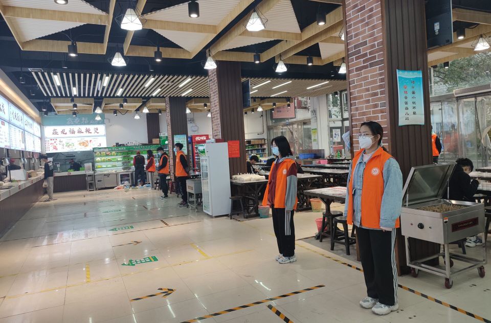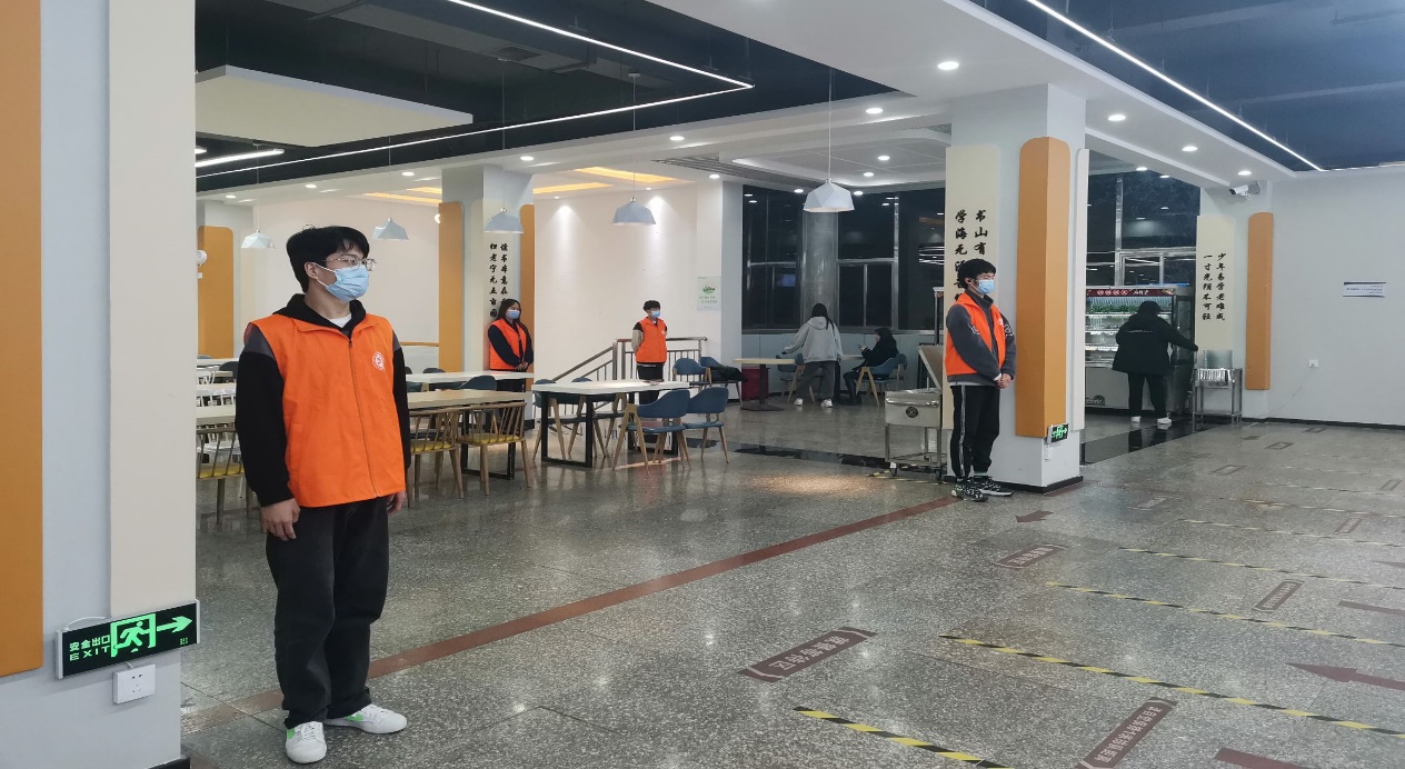 执勤期间,公司员工会成员穿着橙色马甲,分别在三个餐厅的各个用餐地点负责协助食堂人员进行管理,对用餐秩序进行维持,同时对一些不文明现象进行制止,确保食堂就餐环境文明有序,并严格按照规定在协助管理期间佩戴口罩,保持适当距离,牢记防疫宗旨。
