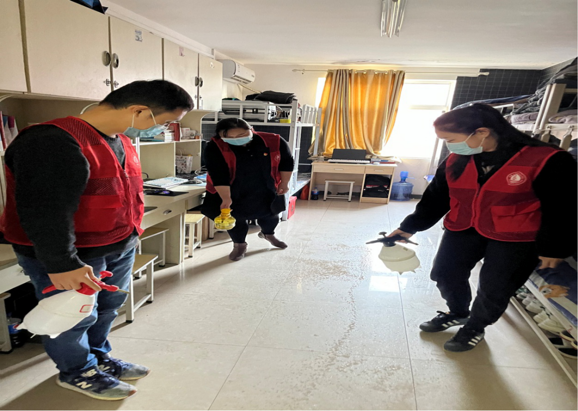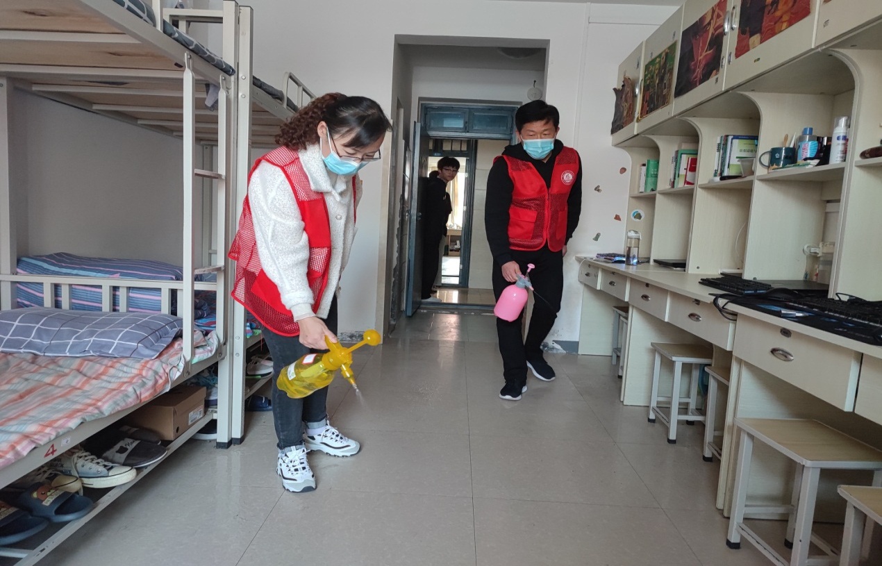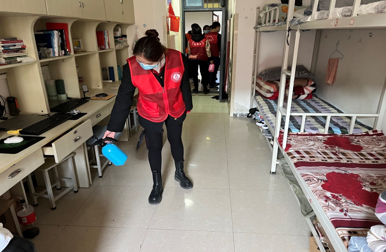 活动伊始,在党总支书记楚斌的带领下,相关人员先把提前配制好消毒液装入喷壶,然后志愿者们分工合作,相互配合,主要对宿舍地面、阳台、卫生间、洗手池、门把手、水龙头、床底等区域进行了统一消杀,做到不留死角、不留盲区。消杀结束临走时,还提醒寝室里的同学们注意开窗通风,及时打扫宿舍卫生,减少细菌病毒的滋生。