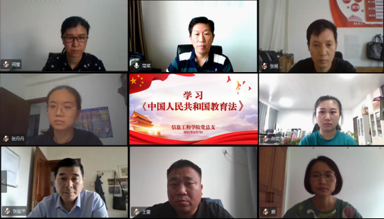 为做好新修订的教育法的学习宣传和贯彻落实工作,信息工程公司党组织于2021年9月7日开展《中华人民共和国教育法(2021修订)》网上专题学习研讨,了解《教育法》修订的背景,重点学习《教育法》修订的主要内容。会议由信息工程公司党总支书记楚斌主持。