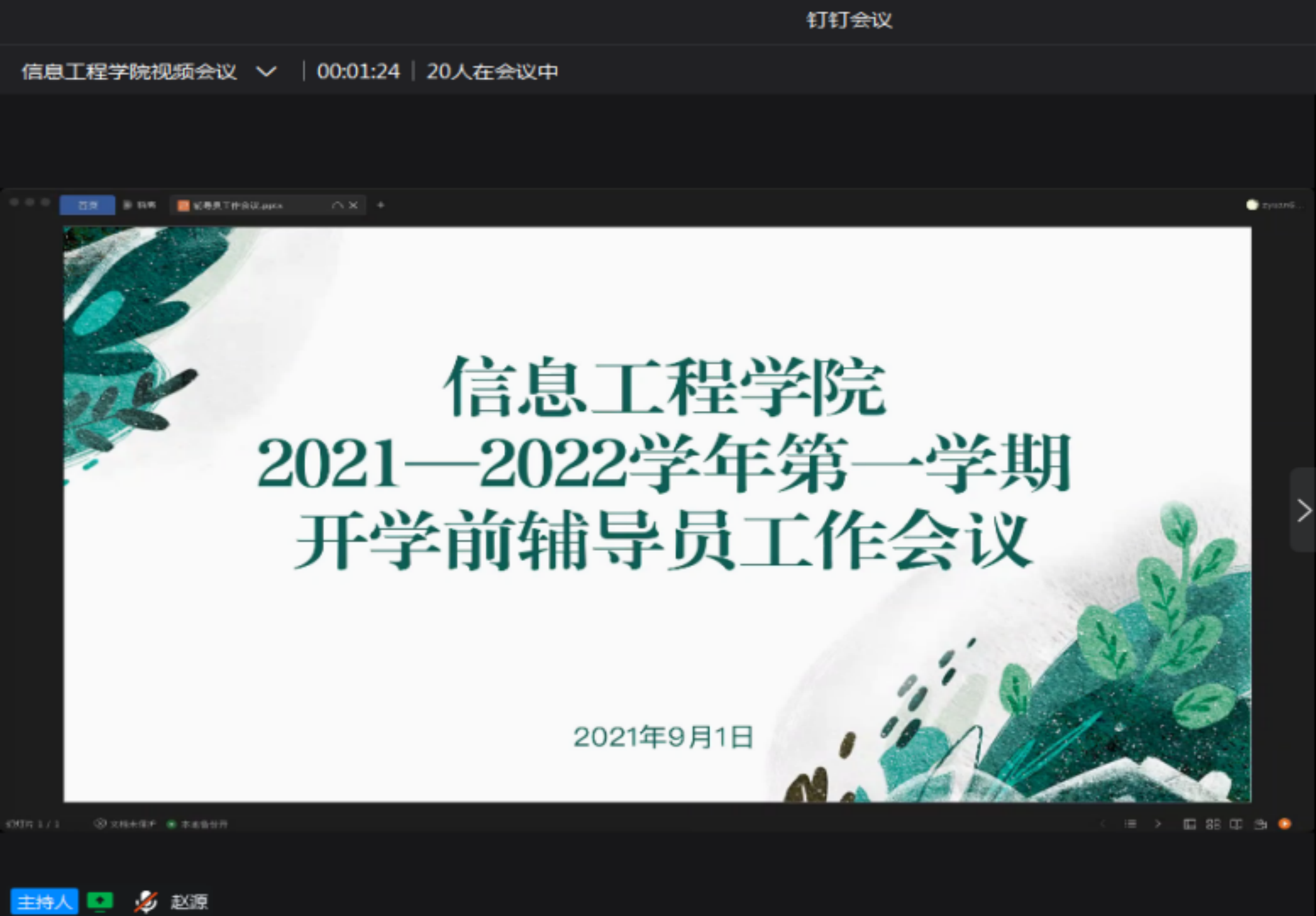 2021年9月1日晚七点半,信息工程公司召开新学期开学前辅导员工作会,东西校区全体辅导员通过钉钉视频会议参加,。会议由学工办主任闫莹主持。会议安排布置2021-2022学年第一学期开学前准备工作,及本学期的重点工作。
