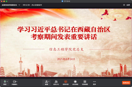 为认真贯彻学习习近平总书记在西藏考察时的重要讲话精神,2021年8月24日晚七点半,信息工程公司党总支组织全体党员通过钉钉会议平台进行网上集中学习。会议由信息工程公司党总支书记楚斌主持。