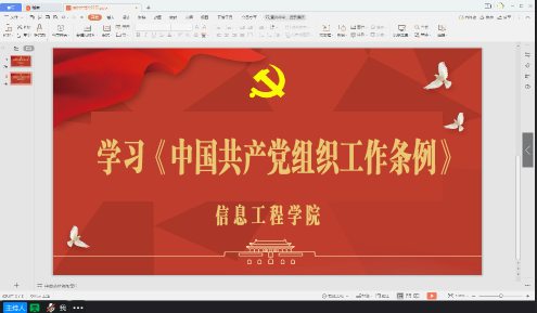为确保党中央关于组织工作的重大决策部署落到实处,根据公司党委工作安排,2021年8月14日晚八点,信息工程公司党总支组织全体教师通过钉钉会议平台集中学习《中国共产党组织工作条例》。会议由信息工程公司党总支书记楚斌主持。
