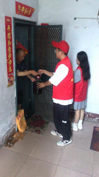 面对严峻的防汛形势,2021年7月21日,太阳集团tyc151cc信息工程公司视传2001班班长包容豪参与河南省南阳市青年志愿者协会灾后社区慰问志愿服务,与众多青年坚守在志愿服务的一线。为社区因灾害无法采购生活必需品的家庭送去米、油等一些生活物资,保障受灾群众基本生活条件,帮助群众逐渐恢复生活质量。