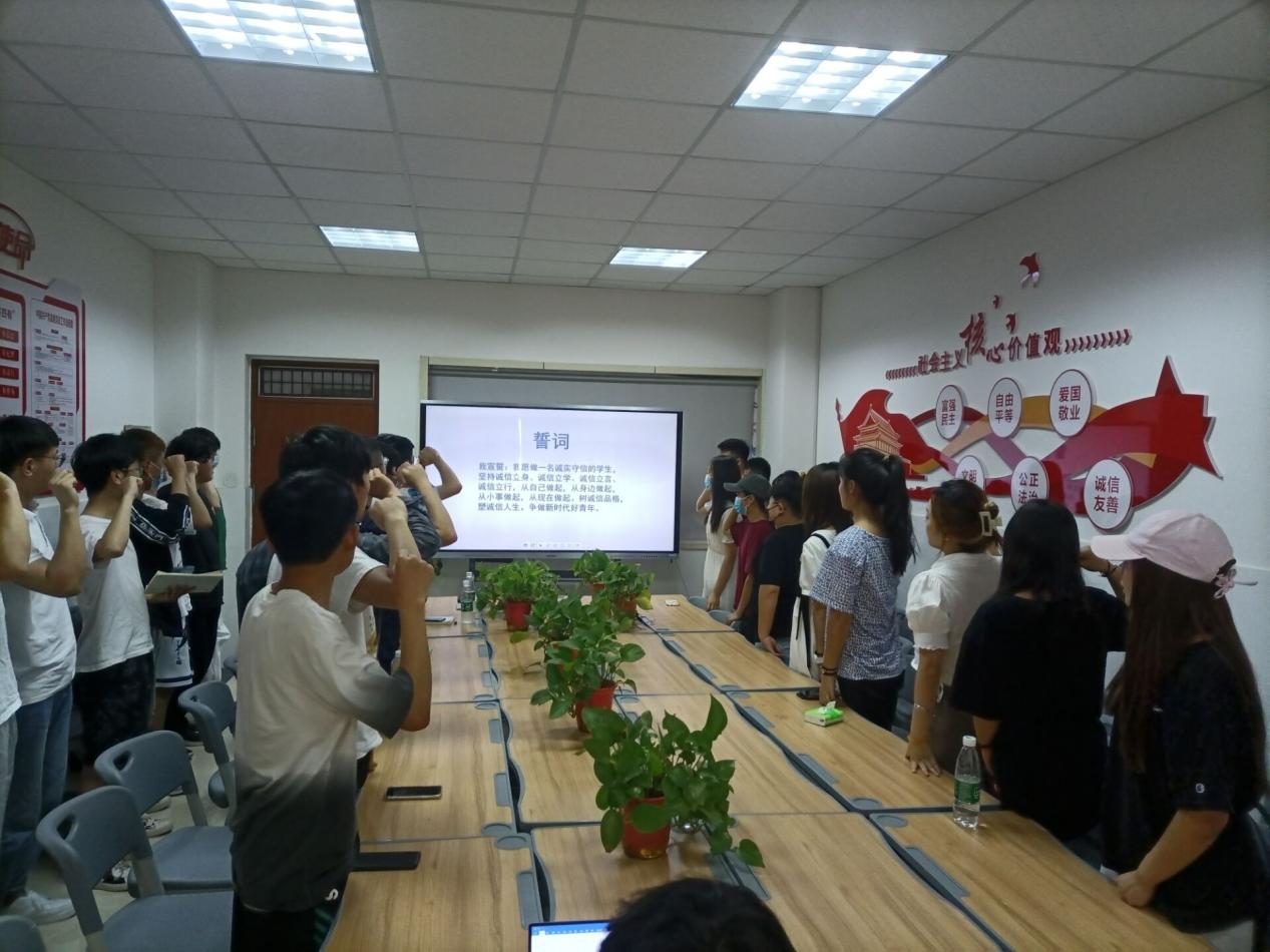 “我郑重承诺,严格遵守国家规定,恪守诚信道德规范……”315教室内宣誓声响彻云霄,在员工代表翟战雨的带领下,同学们共同进行了“诚信还贷”宣誓。誓言铿锵有力,表明了同学们坚定的决心与信念。