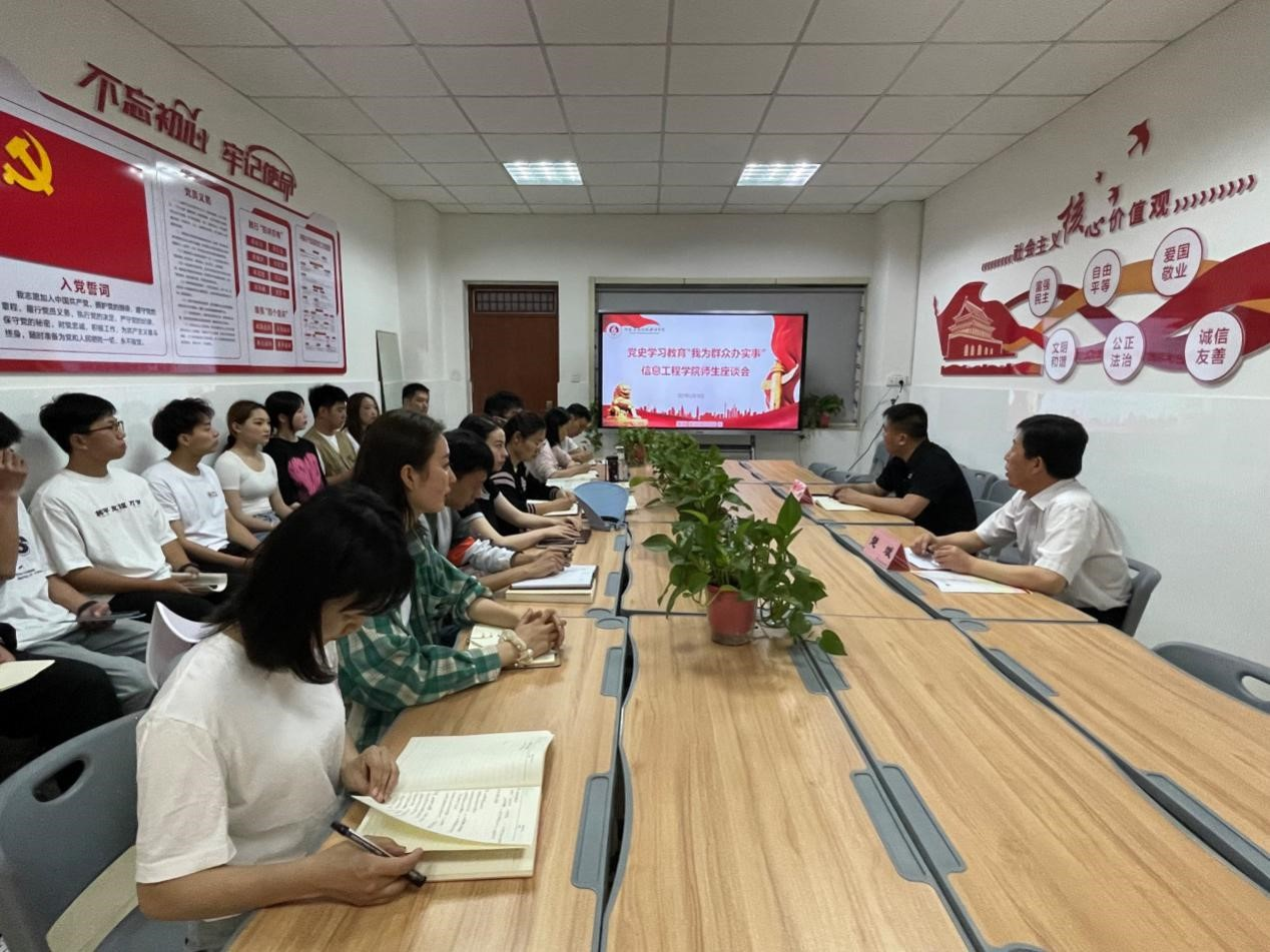 为深化党史学习教育开展,推动“我为群众办实事”主题实践活动取得实效,2021年5月19日上午,信息工程公司党总支在西校区E315党员活动室,召开信息工程公司师生座谈会。信息工程公司党政负责人、师生代表参加了本次座谈会,会议由信息工程公司团总支书记赵源主持。