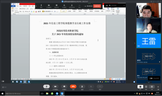 2021年1月11日晚20:00,信息工程公司东西校区全体教师召开钉钉视频会议,安排部署寒假期间的疫情防控、教学工作安排和辅导员学期考核事宜,会议由赵源主持,东西校区参会老师共44人,无缺席。
