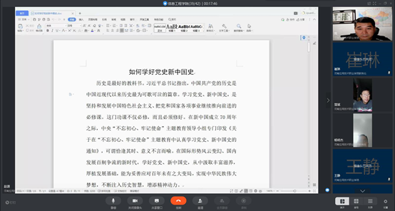 “历史是最好的教科书”,习近平总书记指出,中国共产党的历史是中国近现代以来历史最为可歌可泣的篇章。为深入学习贯彻习近平总书记关于党史、新中国史、改革开放史、社会主义发展史学习的重要讲话精神,坚定“四个自信”,根据公司有关通知要求,信息工程公司党总支组织全体教师和19级员工于2020年8月4日晚召开钉钉视频会议开展以“不忘初心,砥砺前行”为主题的党史新中国史学习教育活动,本次会议由杨明杰书记主持,党总支书记楚斌首先领学《如何学好党史新中国史》,他指出:一是要把学习党史新中国史与传承党的革命传统优良作风结合起来,二是要把学习党史新中国史与为人民守初心为民族担使命结合起来,三是要把学习党史新中国史与学懂弄通新时代的创新理论结合起来,四是要把学习党史新中国史与提高中国共产党的执政本领结合起来。接着组织全体师生观看纪录片《中国有了共产党1 东方欲晓》,大家深深感受到20世纪初中国先进知识分子对真理的探索。