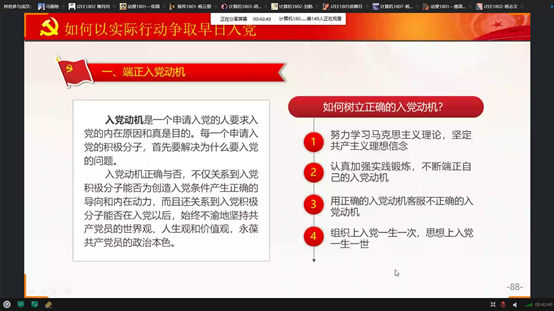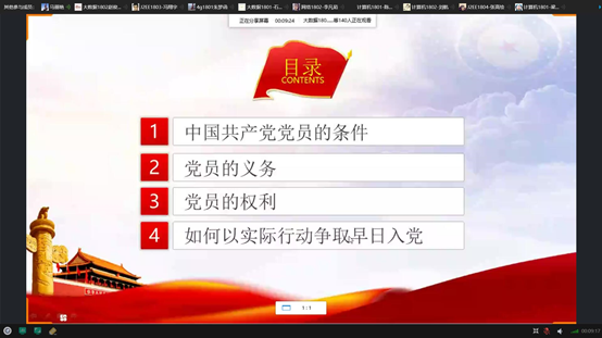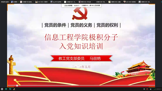 为进一步提高入党积极分子的政治理论水平,加强党员发展工作的质量。2020年5月21日晚,信息工程公司教工支部组织委员马丽艳老师通过QQ群屏幕共享为153名入党积极分子讲述了党课培训第七讲《党员的条件、义务和权利》。