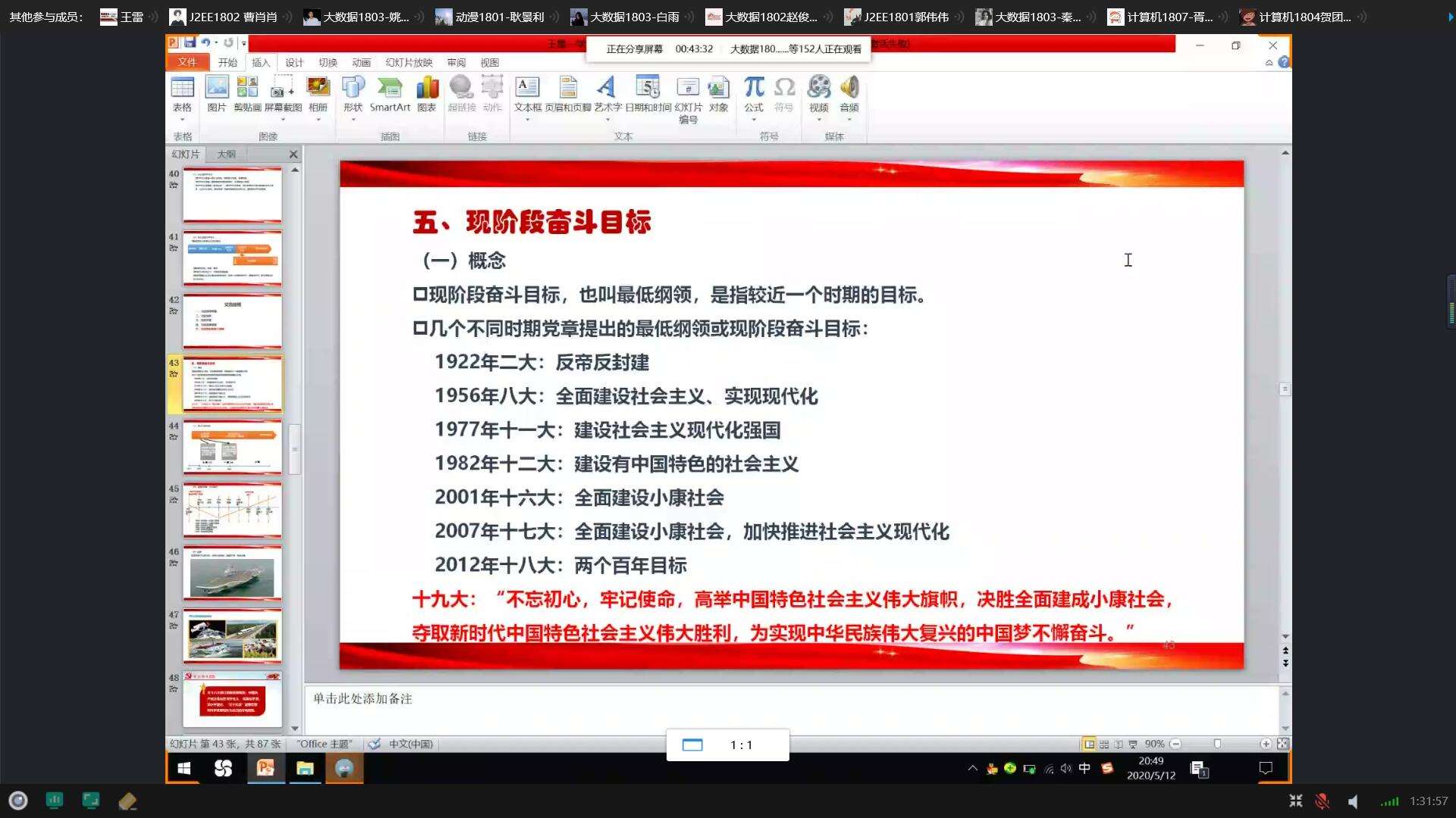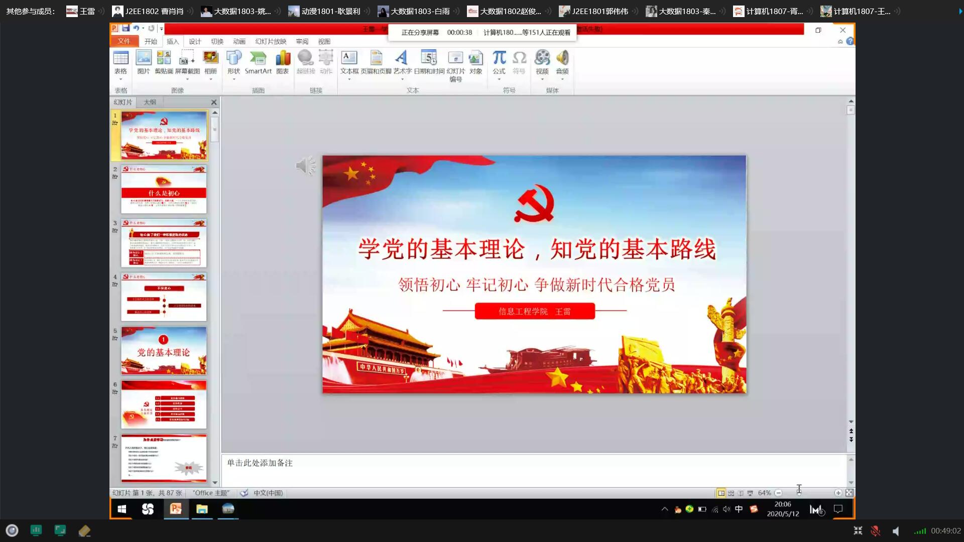 为深入学习党的十九大精神,贯彻落实习近平新时代中国特色社会主义思想,不断增强入党积极分子对党的基本理论、基本路线、基本方略的认识,2020年5月12日信息工程公司王雷经理通过QQ群屏幕共享为154名入党积极分子讲述了党课培训第四讲《党的基本理论、基本路线、基本方略》。