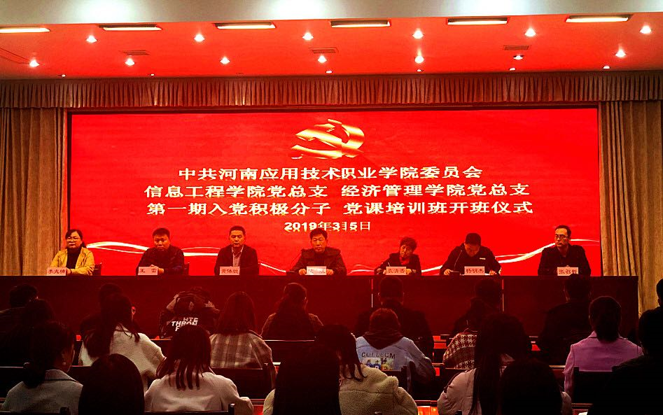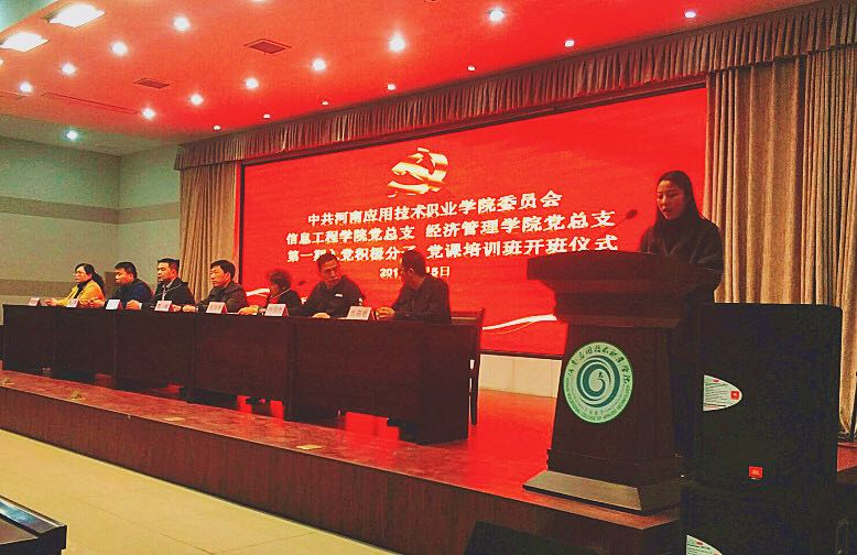 2019年3月5日下午,信息工程公司党总支、经济管理公司党总支第一期入党积极分子党课培训班开班仪式在实训楼二楼会议室隆重举行。两总支书记及全体支委委员、本期入党积极分子出席大会。信息工程公司党总支副书记杨明杰主持大会。大会开始,杨明杰书记宣读了此次培训班的具体通知,随后,信息工程公司刘雅迪同学代表本次培训班学员发言。