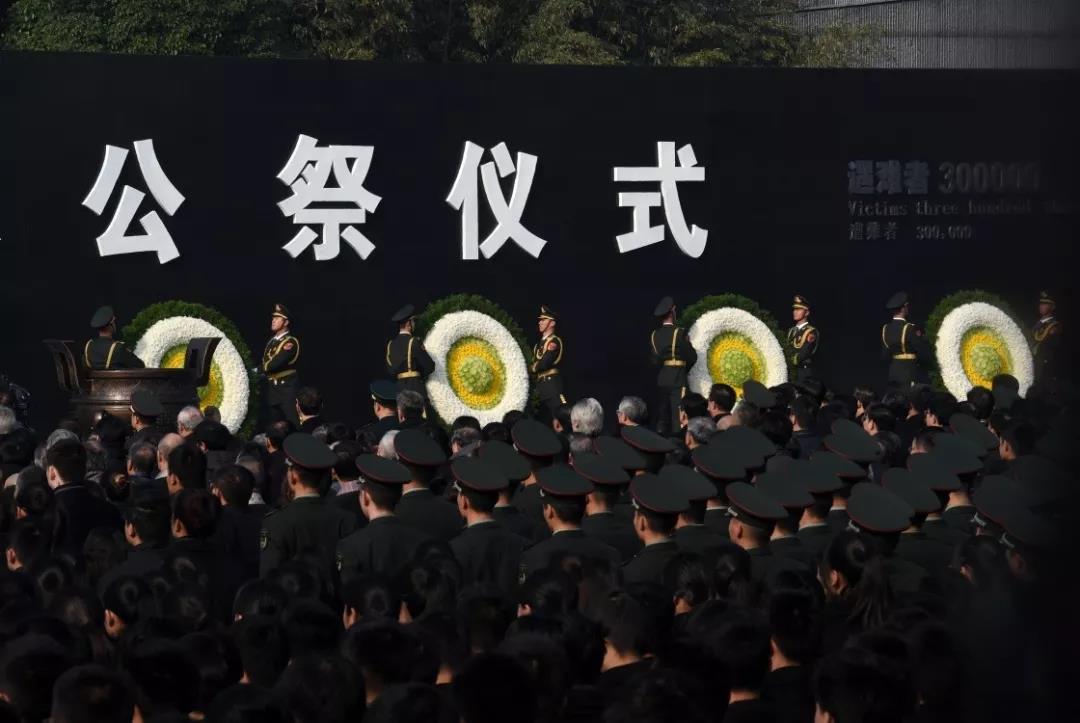 默哀毕,在军乐团演奏的《国家公祭献曲》的旋律中,解放军仪仗大队礼兵将8个花圈敬献于公祭台上。
