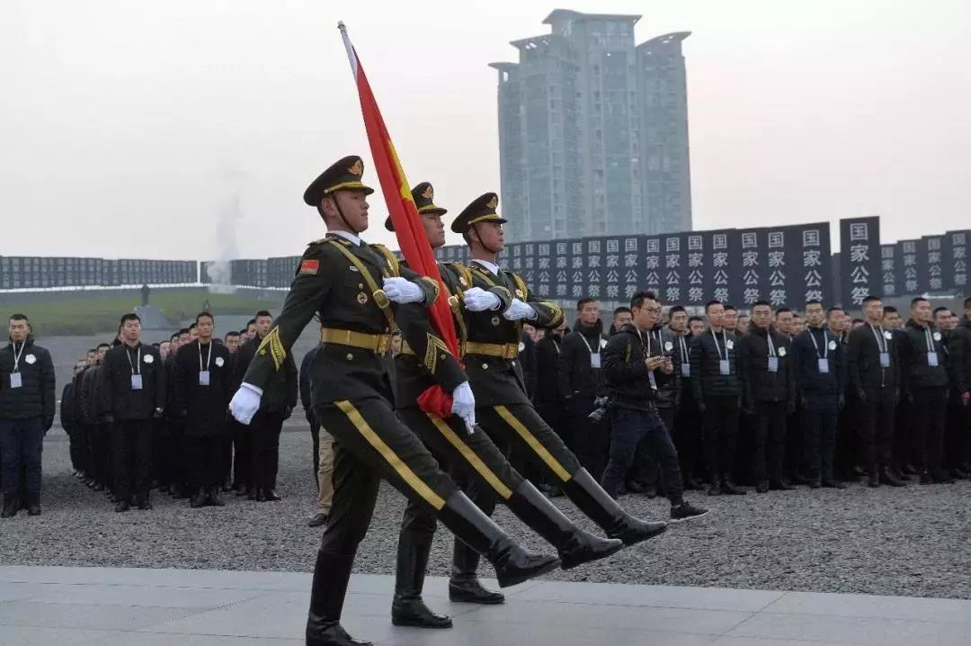 公祭仪式在侵华日军南京大屠杀遇难同胞纪念馆举行。纪念馆集会广场庄严肃穆,现场国旗下半旗。广场西侧的“灾难墙”上,灰黑的底色映衬着“南京大屠杀死难者国家公祭仪式”14个白色大字。8000余名各界代表胸前佩戴白花,静静肃立。解放军仪仗大队18名礼兵齐步行进至公祭台两侧伫立。