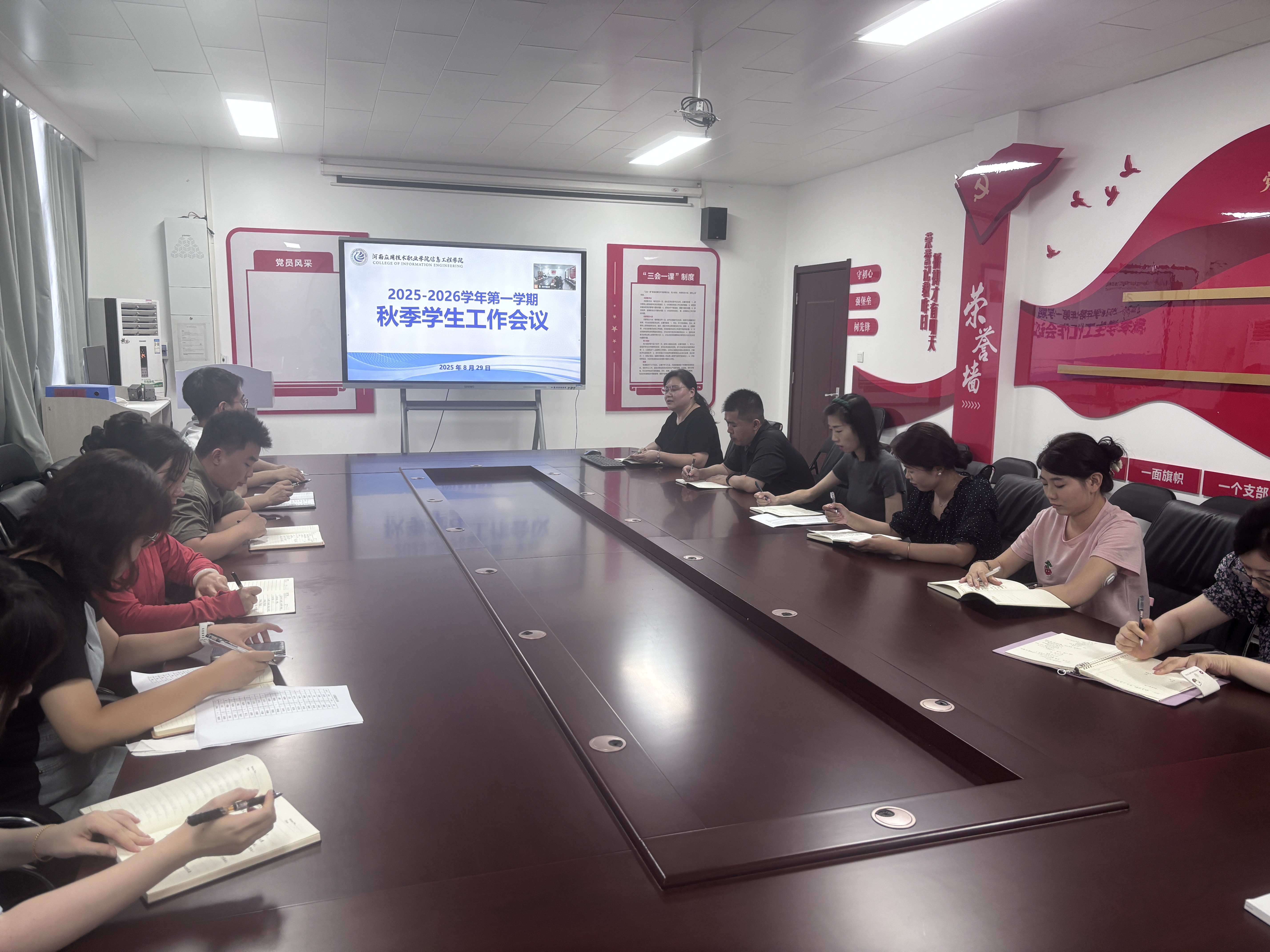8月29日下午,信息工程公司在郑州校区A514、开封校区F302,召开2025-2026学年第一学期秋季员工工作会议。会议由党总支书记崔琳主持,全体专兼职辅导员参会。