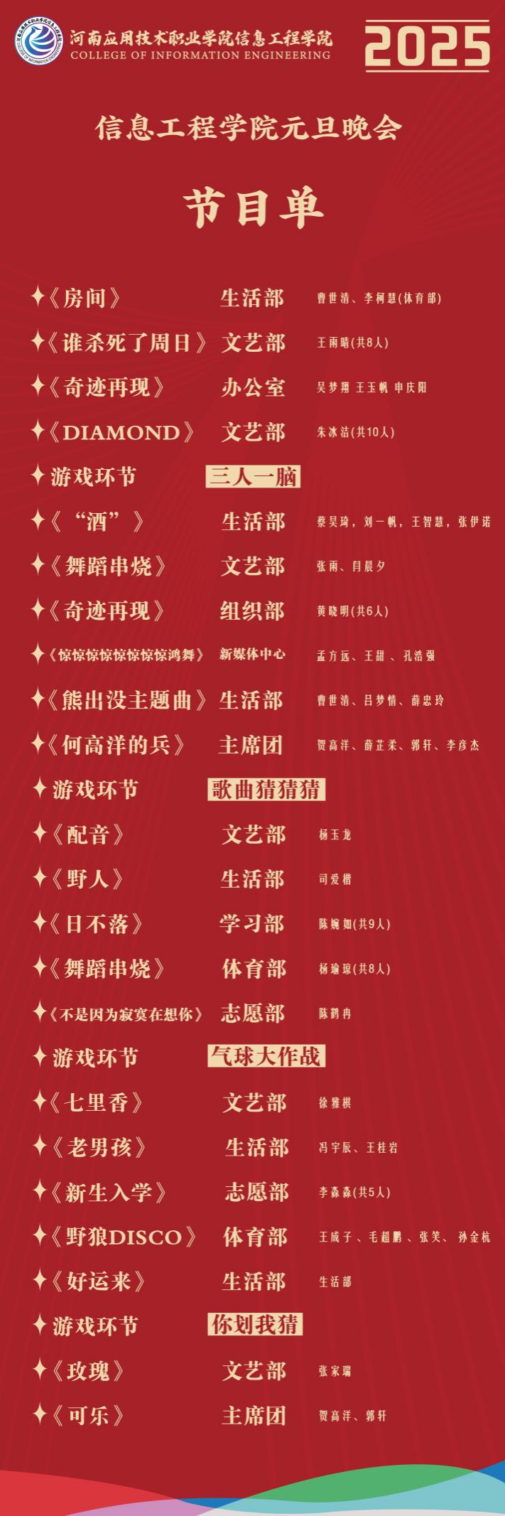 为庆祝元旦佳节,信息工程公司将于2024年12月31日开展元旦晚会,届时将有多姿多彩的节目轮番上映,快来和小信一起先睹为快!