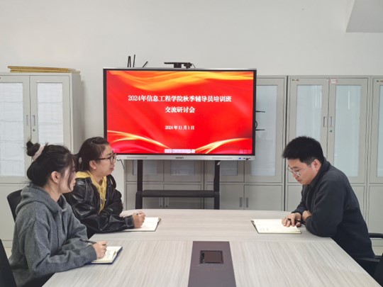 为切实加强辅导员队伍建设,不断提高辅导员队伍工作能力和业务水平,搭建、完善辅导员工作交流和素质提升平台,进一步提升辅导员队伍的战斗力、凝聚力,促进辅导员队伍向职业化、专业化方向发展,,11月1日信息工程公司于开封校区E314,郑州校区A514同步开展2024年秋季辅导员培训班交流研讨会。会议由信息工程公司党总支副书记蒋欣哲主持。全体辅导员参会。