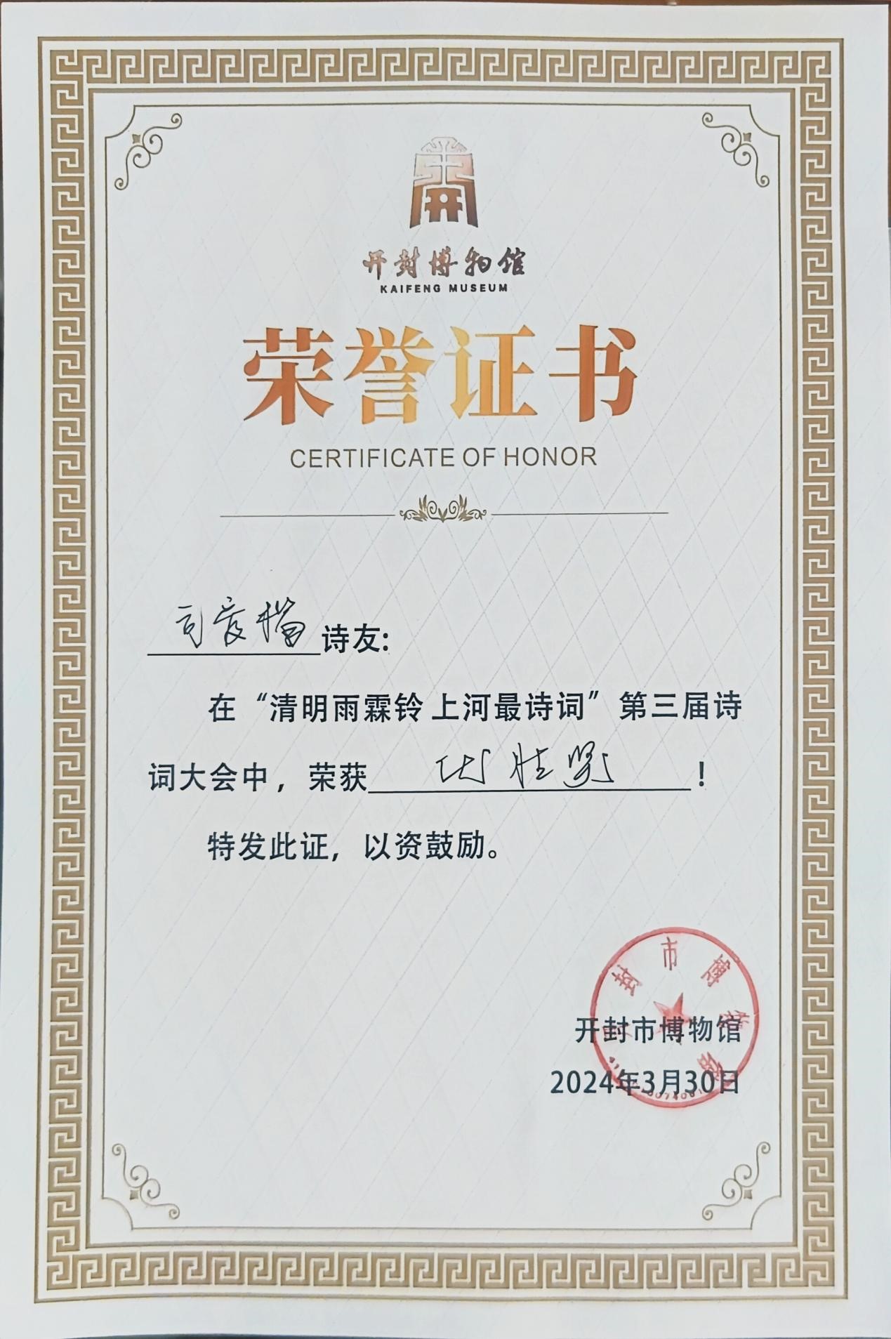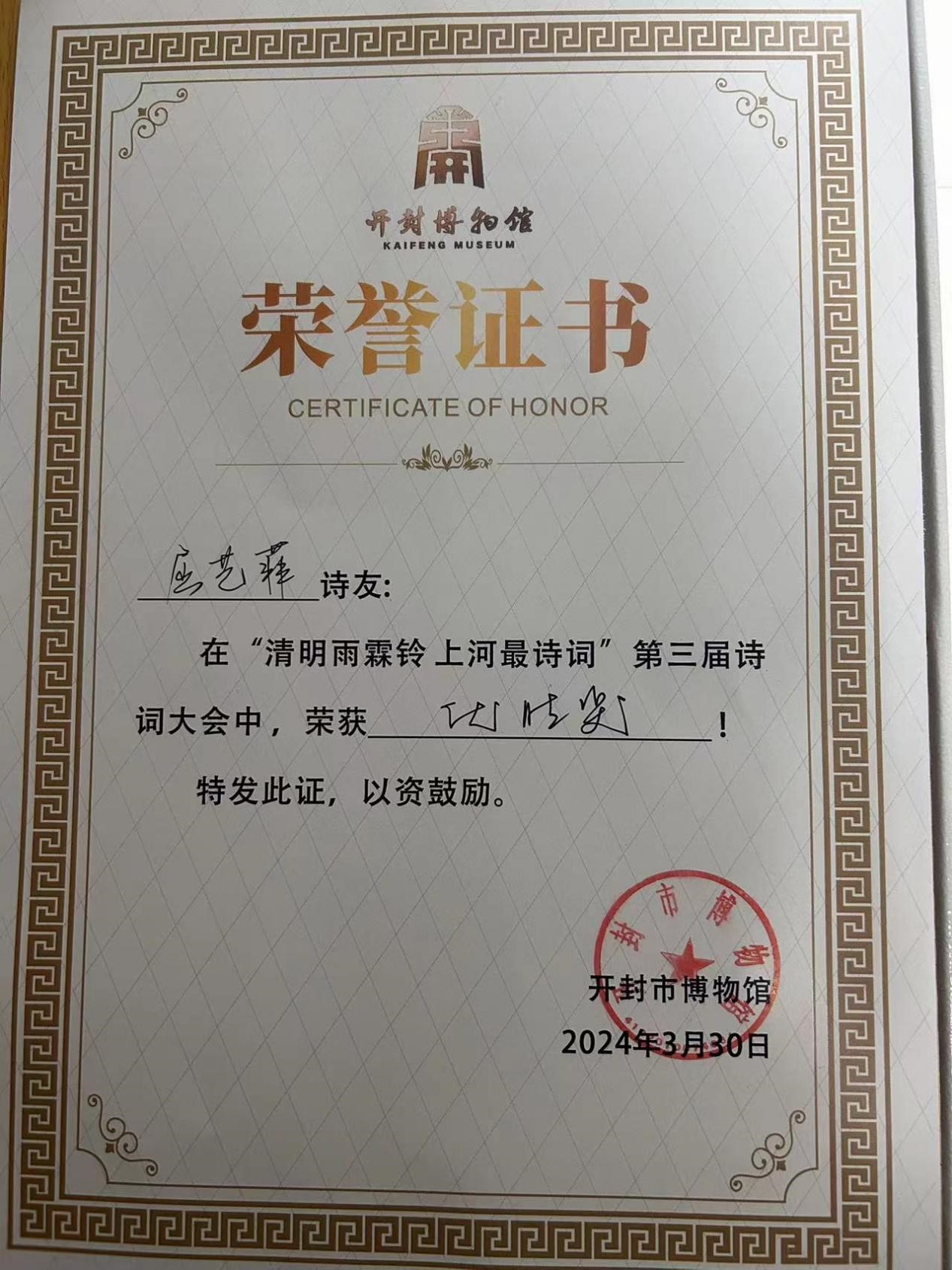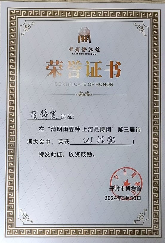 今天,我来到开封博物馆,内心充满了激动与喜悦。很荣幸能在开封博物馆举办的“第三届诗词大会”中获奖,这是我人生中一份特殊的、难忘的回忆。我们在比赛中互相学习、共同进步,这种氛围让我深受感动。在比赛中,我深入领略了诗词的韵味,感受到了中华文化的深厚底蕴。这次获奖是对我过去努力的肯定,也是对我未来学习的鞭策。我将珍惜这份荣誉,继续努力提升自己的诗词素养,为传承和弘扬中华文化贡献自己的力量。